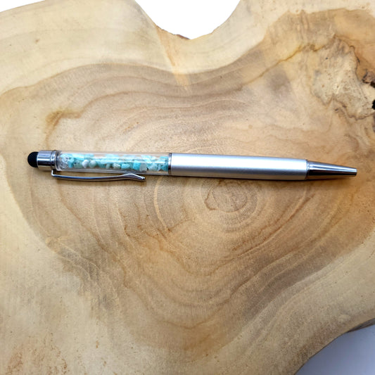 DIVERS STYLOS à BILLES EN PIERRES SEMI-PRÉCIEUSES (base métal argentée) - COULEURS & PIERRES AU CHOIX