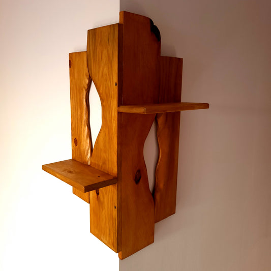 GRANDE ÉTAGÈRE D'ANGLE EXTÉRIEUR + 2 OUVERTURES SCULPTÉES & 2 TABLETTES DÉCALÉES EN BOIS DE PIN - MODÈLE ÉCOLO, ARTISANAL, ORIGINAL & UNIQUE