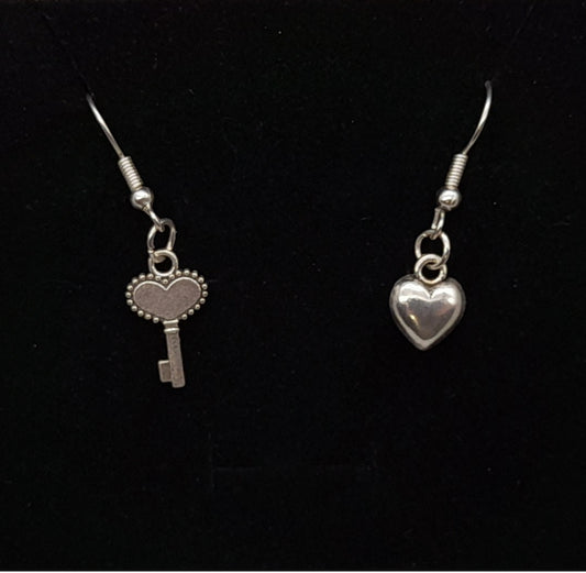 BOUCLES D'OREILLES ORIGINALES EN DUO : CLÉ + COEUR BOMBÉ ARGENTÉ - BIJOUX FANTAISIES
