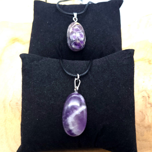 COLLIER + PENDENTIF GALET POLI EN PIERRE AMÉTHYSTE RUBANÉE - BIJOU ARTISANAL, UNIQUE & ORIGINAL