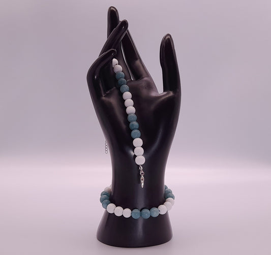 BRACELETS EN DUO DE PERLES RONDES EN PIERRES AIGUE MARINE + ONYX BLANC - 2 TAILLES AU CHOIX - BIJOUX ARTISANAUX, UNIQUES & ORIGINAUX