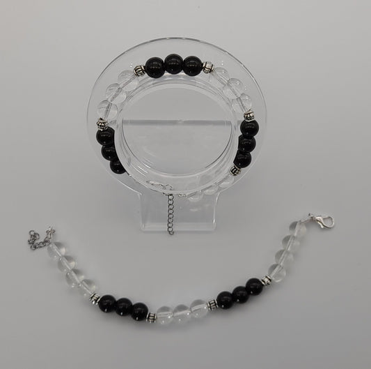 BRACELETS EN DUO DE PERLES RONDES EN PIERRES ONYX NOIR + CRISTAL DE ROCHE - 2 TAILLES AU CHOIX - BIJOUX ARTISANAUX, UNIQUES & ORIGINAUX