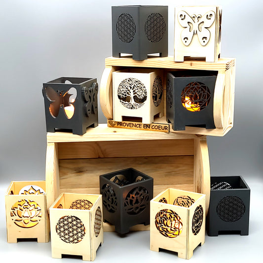 PHOTOPHORES EN BOIS NATUREL + VERNIS + BOUGIES COEUR - DIVERS MODÈLES (ARBRE DE VIE, PAPILLON...) - UNIQUES, ORIGINAUX & ARTISANAUX