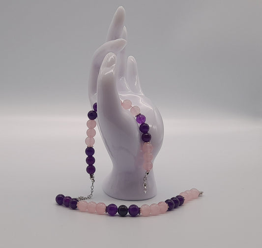 BRACELETS EN DUO DE PERLES RONDES EN PIERRES QUARTZ ROSE + AMÉTHYSTE - 2 TAILLES AU CHOIX - BIJOUX ARTISANAUX, UNIQUES & ORIGINAUX