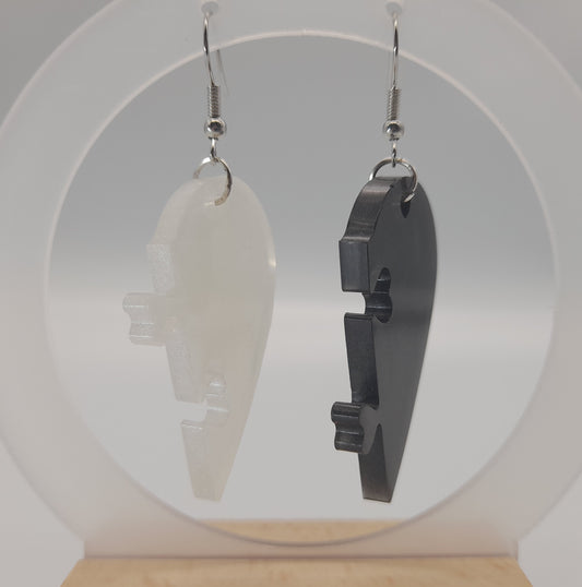 GRANDES BOUCLES D'OREILLES EN DUO " 3 COEURS EN PUZZLE YIN YANG " EN RÉSINE - BIJOUX FANTAISIES ARTISANAUX, UNIQUES & ORIGINAUX