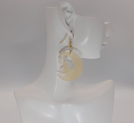 GRANDES BOUCLES D'OREILLES EN DUO CHAT RÊVEUR + CHAT JOUEUR SUR CROISSANT DE LUNE EN RÉSINE - BIJOUX FANTAISIES UNIQUES, ORIGINAUX & ARTISANAUX