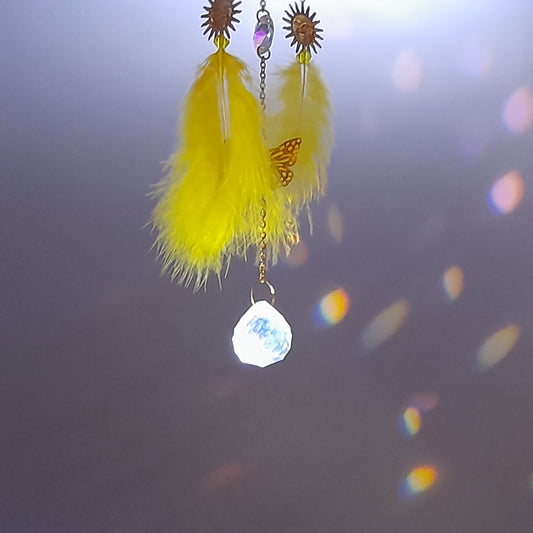 DÉCORATION " 2 EN 1 " DREAMCATCHER + SUNCATCHER TONS DORÉS JAUNES + LOTUS + SOLEILS + PAPILLON - (ATTRAPE-RÊVES avec un ATTRAPE SOLEIL) UNIQUE, ARTISANAL & ORIGINAL