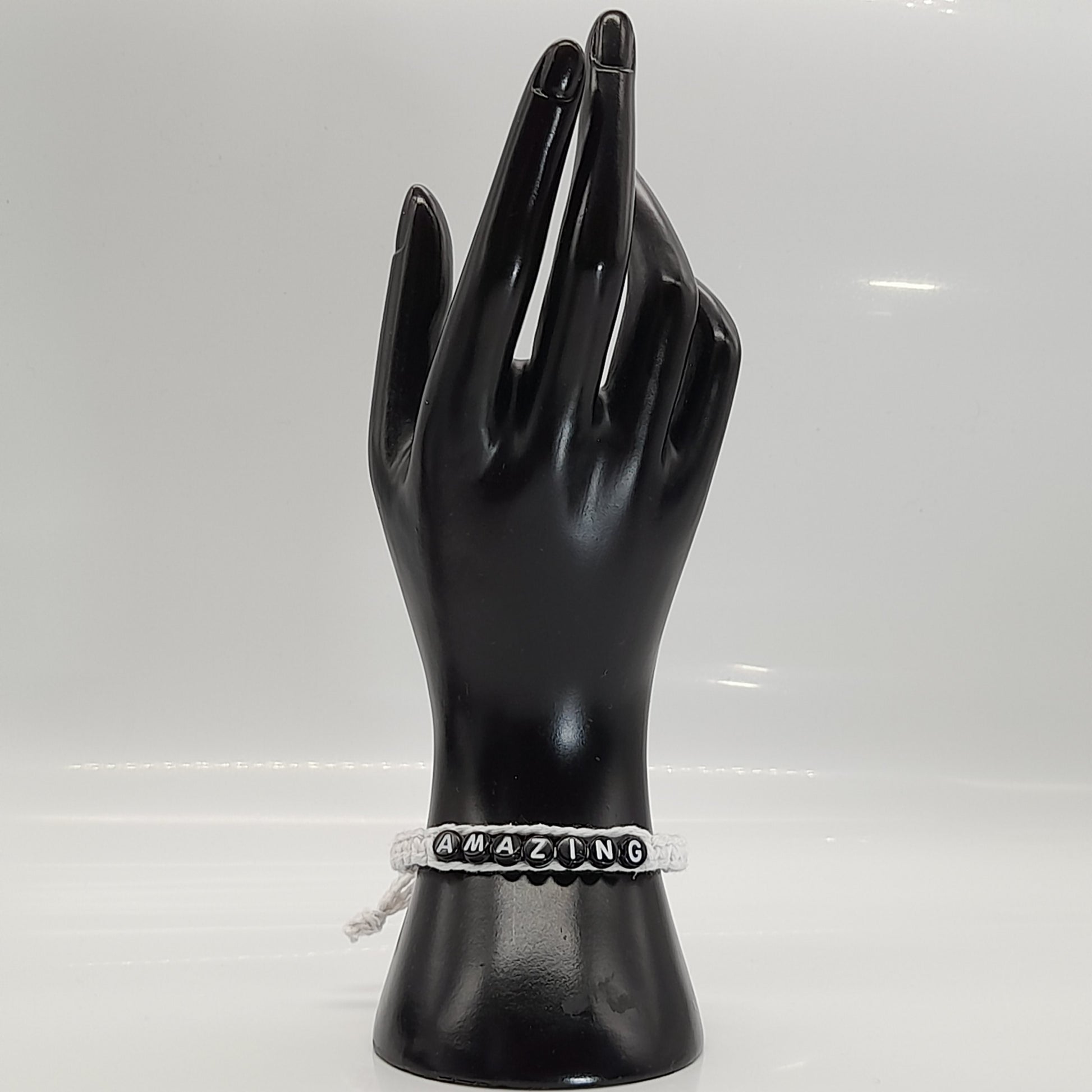 Très sympas ces BRACELETS en MACRAMÉ sont vendus à l’unité. Voici le modèle " AMAZING " sur un bracelet BLANC, parmi nos « MESSAGES FUNS ». Ils sont composés de perles gravées des lettres de l’alphabet ; le tout ficelé de « nœuds plats ». A choisir parmi des expressions connues et couleurs de macramé, où chacun est mis en valeur et en parfaite harmonie. Il est mixte et lavable.