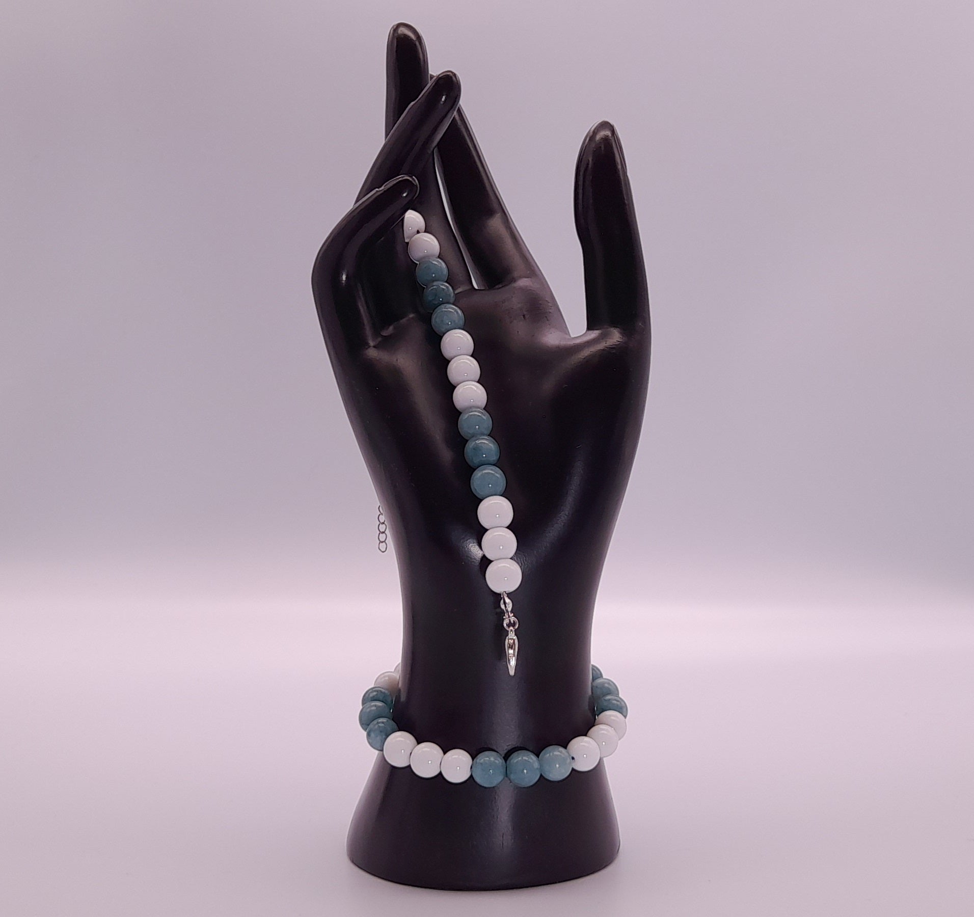 Découvrez ce joli BRACELET, composé de nombreuses PERLES en PIERRES NATURELLES SEMI-PRÉCIEUSES, un DUO de PIERRES D'AIGUE MARINE et D'ONYX BLANC, aux nuances brillantes uniques (coloris bleu gris marbré semi translucide et coloris blanc opaque).