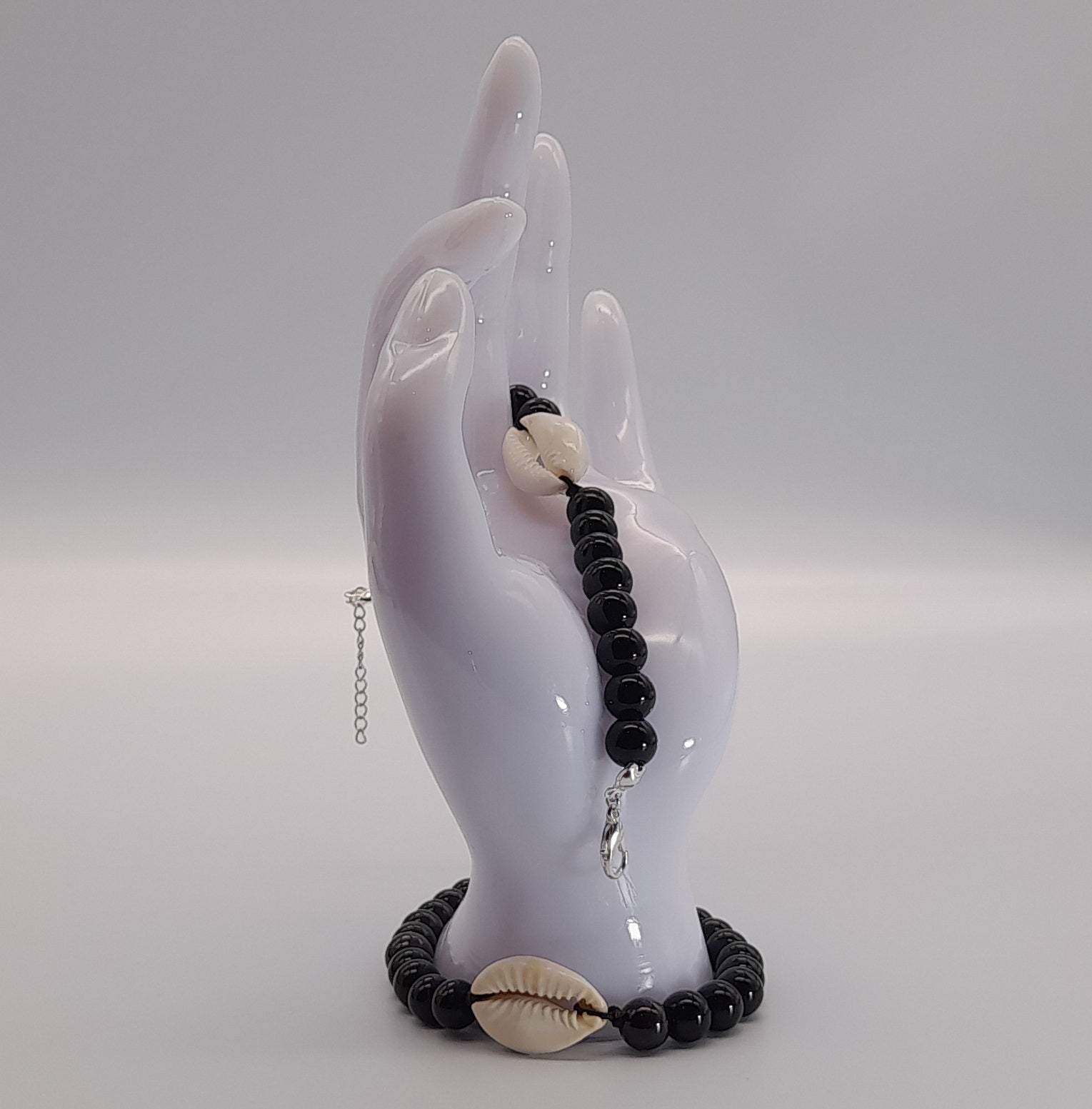 BRACELETS EN PERLES RONDES EN PIERRE ONYX NOIR + CAURI (coquillage) - 2 TAILLES AU CHOIX - BIJOUX ARTISANAUX, UNIQUES & ORIGINAUX