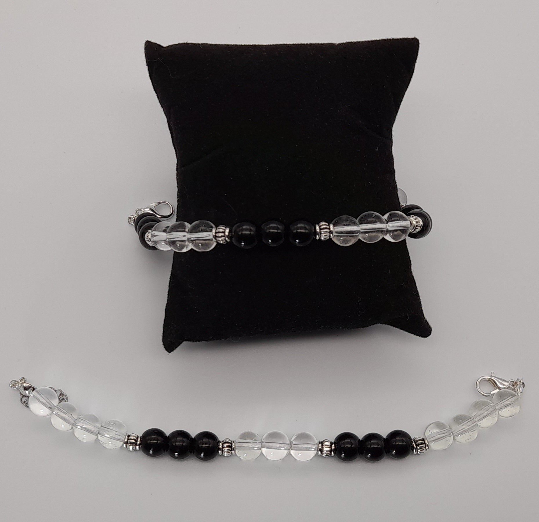 BRACELETS EN DUO DE PERLES RONDES EN PIERRES ONYX NOIR + CRISTAL DE ROCHE - 2 TAILLES AU CHOIX - BIJOUX ARTISANAUX, UNIQUES & ORIGINAUX