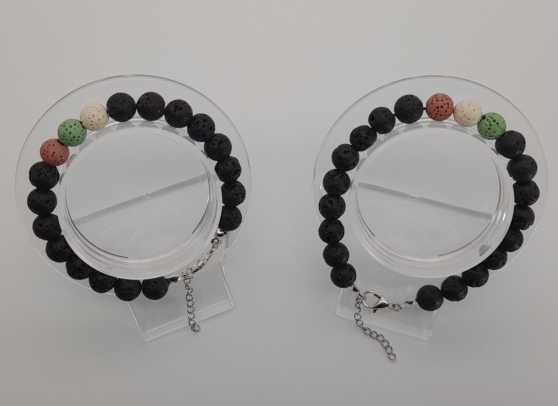 Découvrez ce joli BRACELET ORIGINAL, composé de nombreuses PERLES RONDES en PIERRES de LAVE NATURELLES SEMI-PRÉCIEUSES NOIRES, accompagnées de 3 AUTRES COULEURS au centre, pour contraster et rajouter une touche de fantaisie (3 couleurs aléatoires de lave teintée). Elles ont la texture unique de mini cratères. Ce modèle existe aussi avec des couleurs irisées ici.
