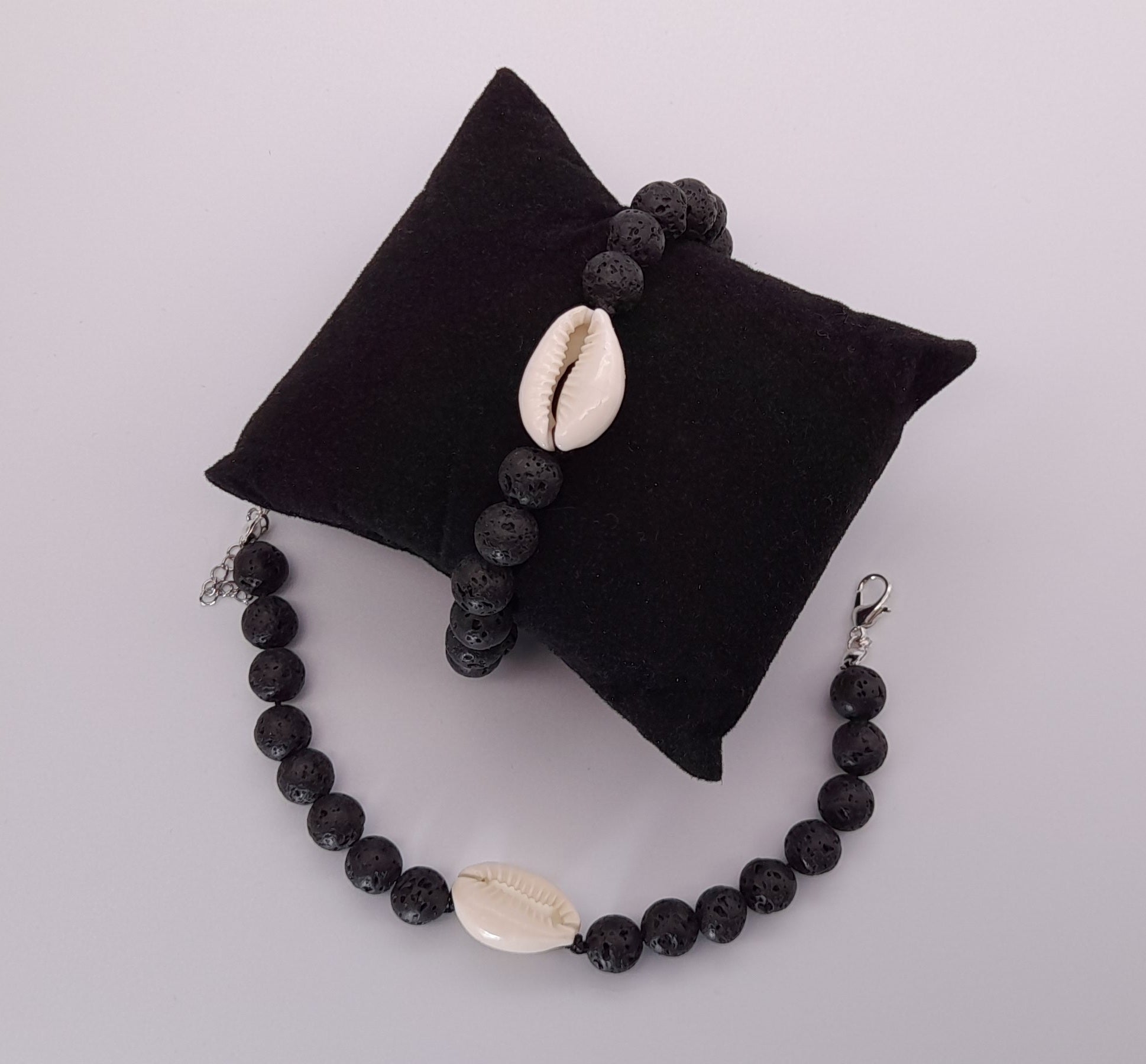 Découvrez ce joli BRACELET, orné d'un CAURI unique (coquillage véritable) et composé de nombreuses PERLES RONDES en PIERRE NATURELLE SEMI-PRÉCIEUSE de PIERRE de LAVE, à la texture unique de mini cratères, de mats à brillants (pierre couleur noire & grise anthracite + Cauri coloris blanc beige).