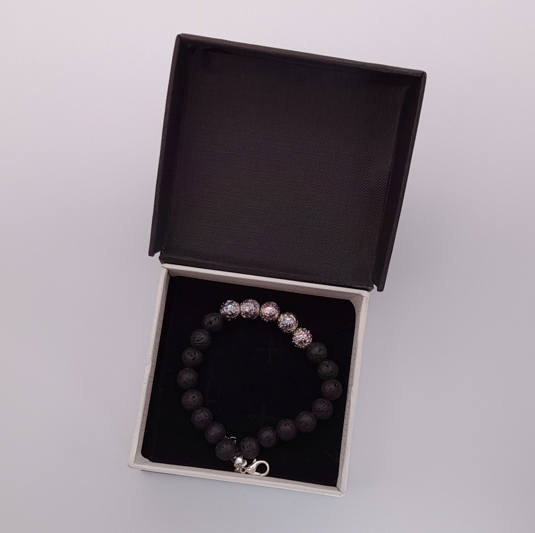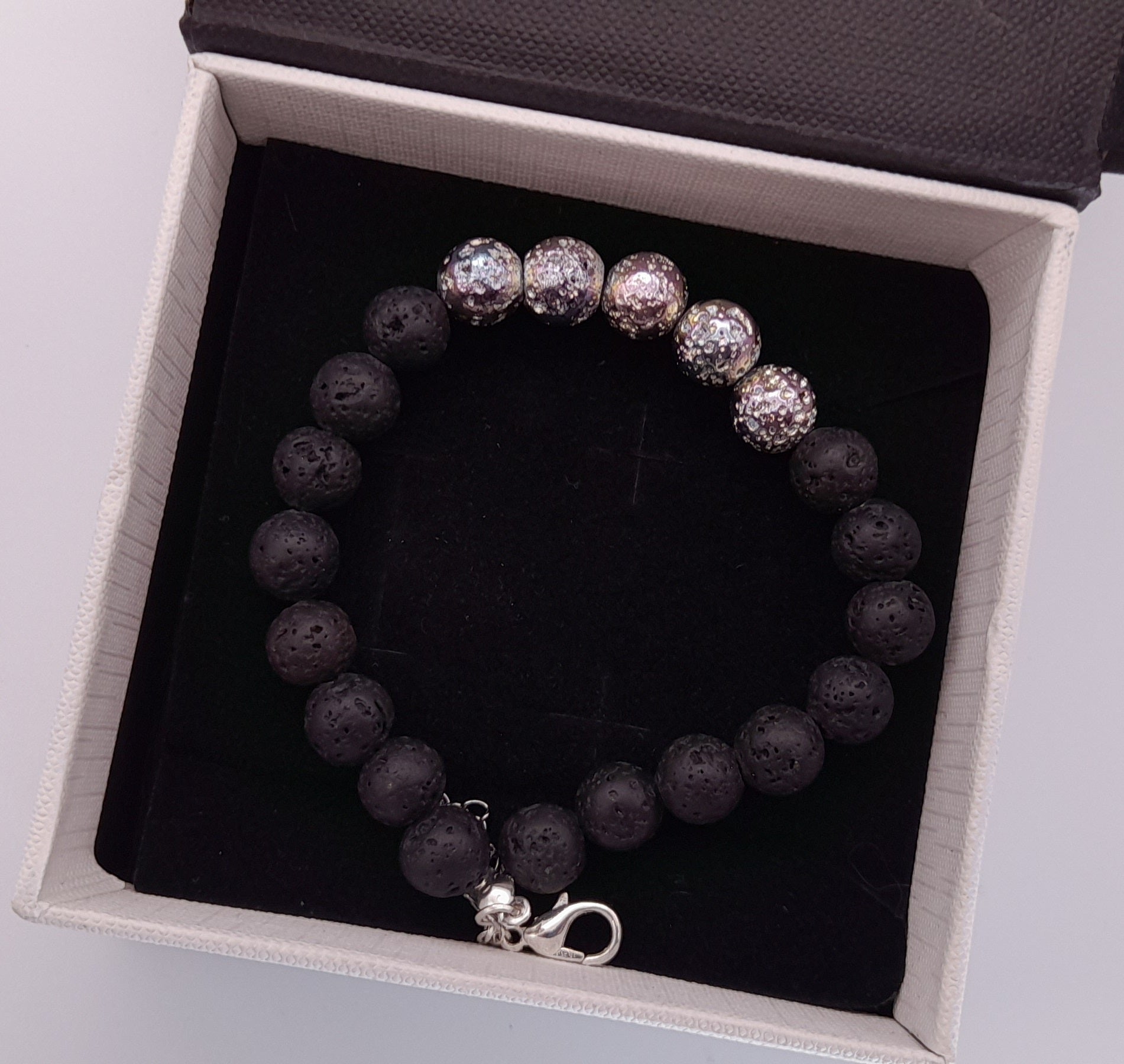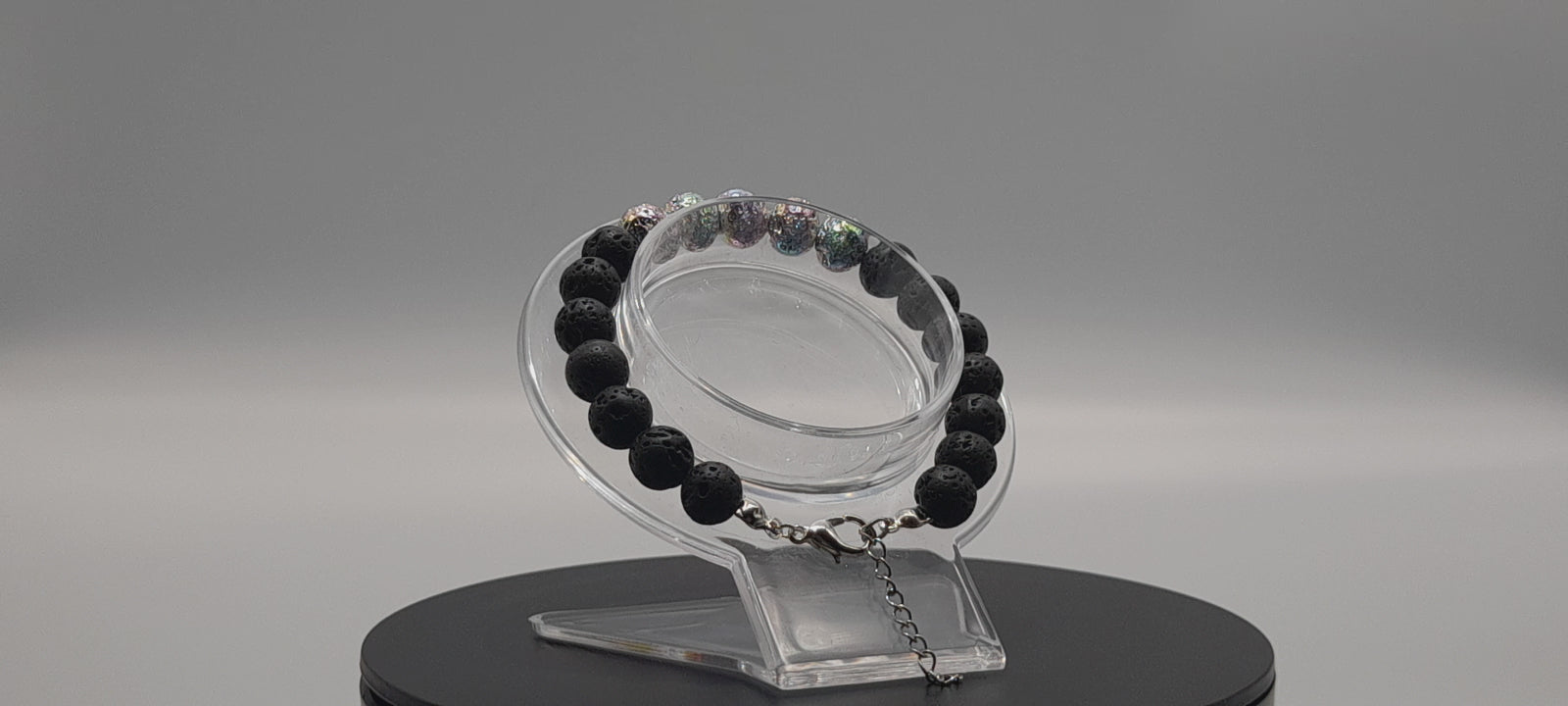 Découvrez ce joli BRACELET ORIGINAL, composé de nombreuses PERLES RONDES en PIERRES de LAVE NATURELLES SEMI-PRÉCIEUSES NOIRES, accompagnées de 5 AUTRES IRISÉES (lave recouverte) au centre. Le rendu est sublime. Elles ont la texture unique de mini cratères (coloris noir, gris anthracite + 5 multicolores irisées). Ce modèle existe aussi avec des couleurs sobres ici.