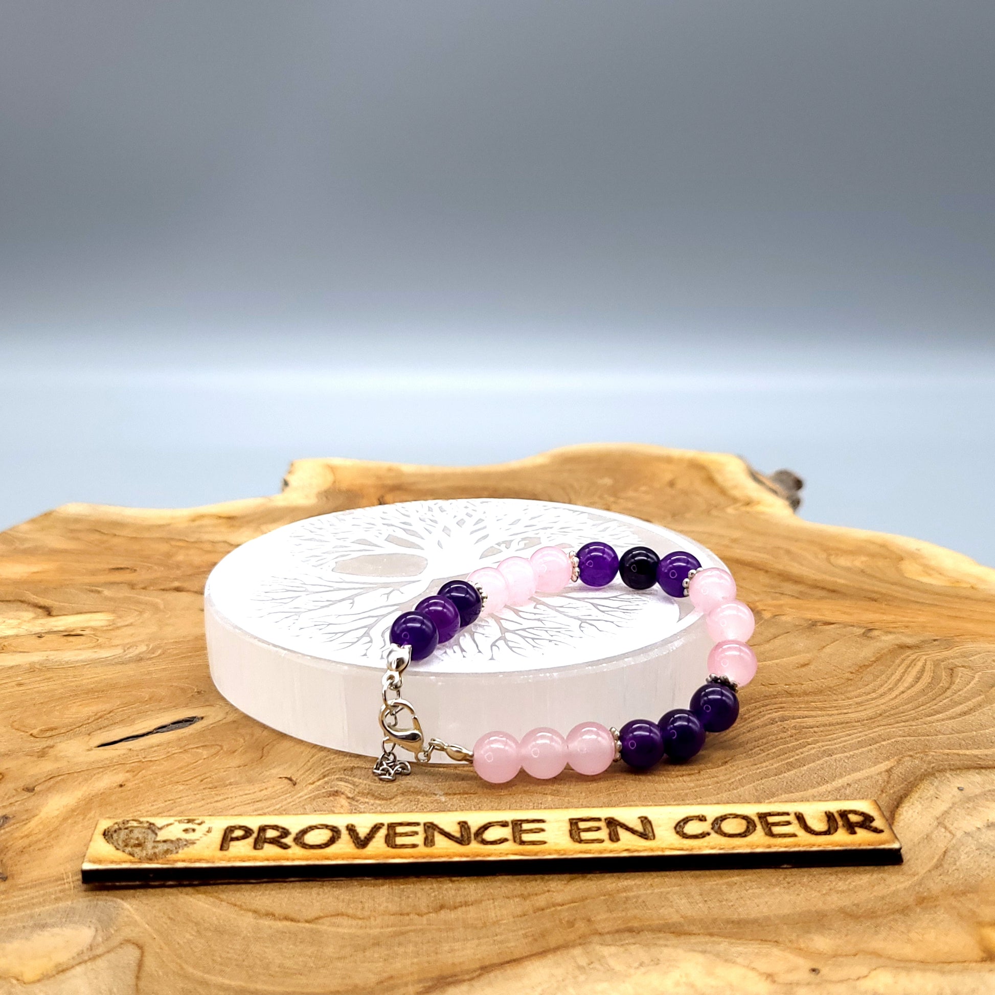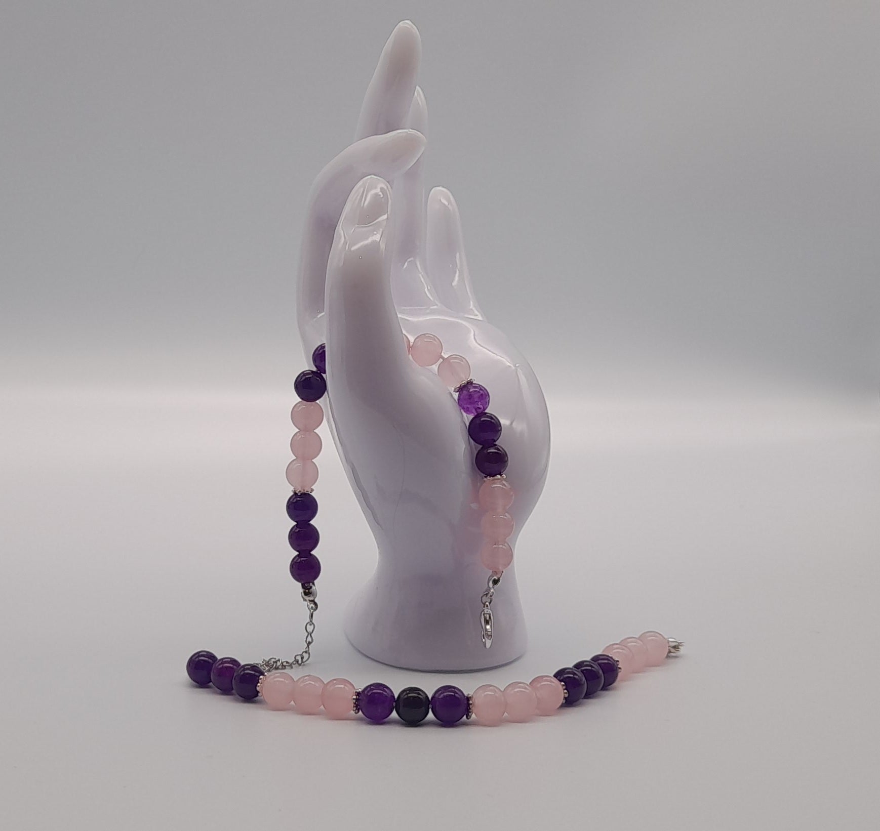 Découvrez ce joli BRACELET, composé de nombreuses PERLES RONDES de PIERRES NATURELLES SEMI-PRÉCIEUSES, un DUO de QUARTZ ROSE et D'AMÉTHYSTE, aux nuances brillantes uniques (coloris rose tendre et violet, mauve). De belles entretoises ont été insérées pour mettre en valeur le sublime contraste de ces 2 pierres.