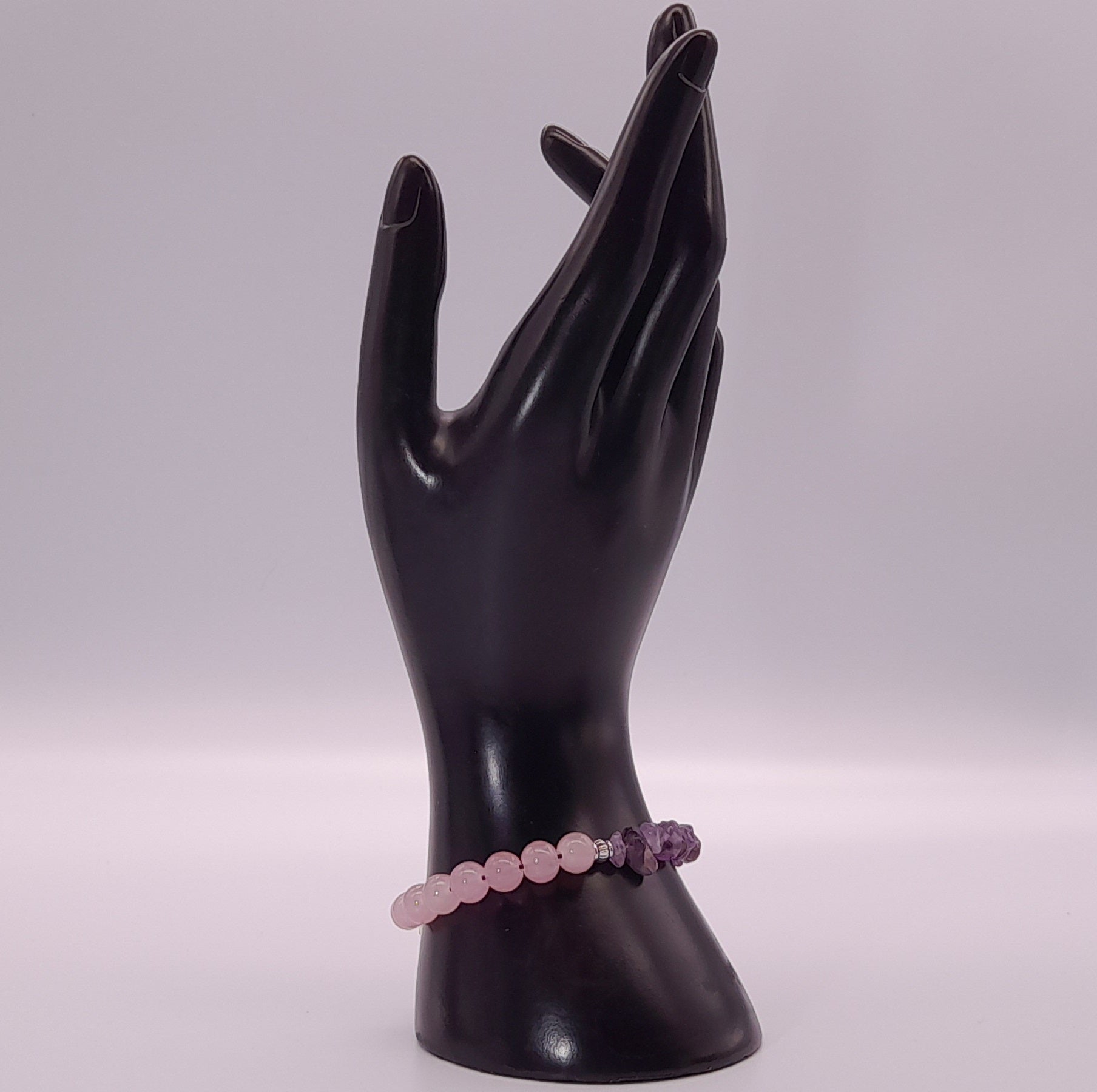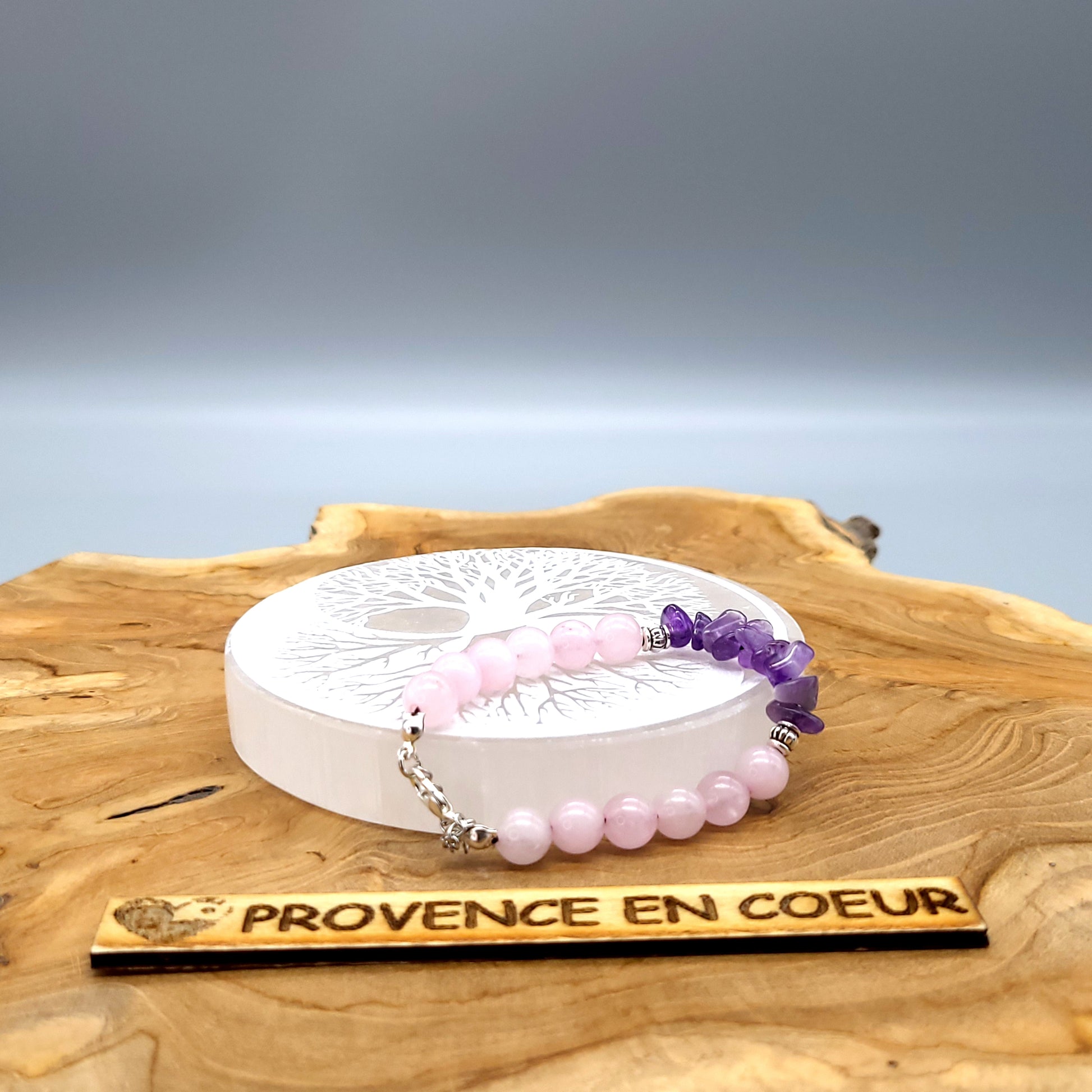 Découvrez ce joli BRACELET, composé de nombreuses PERLES de PIERRES NATURELLES SEMI-PRÉCIEUSES, un DUO de QUARTZ ROSE (perles RONDES) et D'AMÉTHYSTE (perles de CHIPS ="éclats" irréguliers polis), aux nuances brillantes uniques (coloris rose tendre et violet, mauve). De belles entretoises en métal ont été insérées pour mettre en valeur le sublime contraste de ces 2 pierres (formes et couleurs).