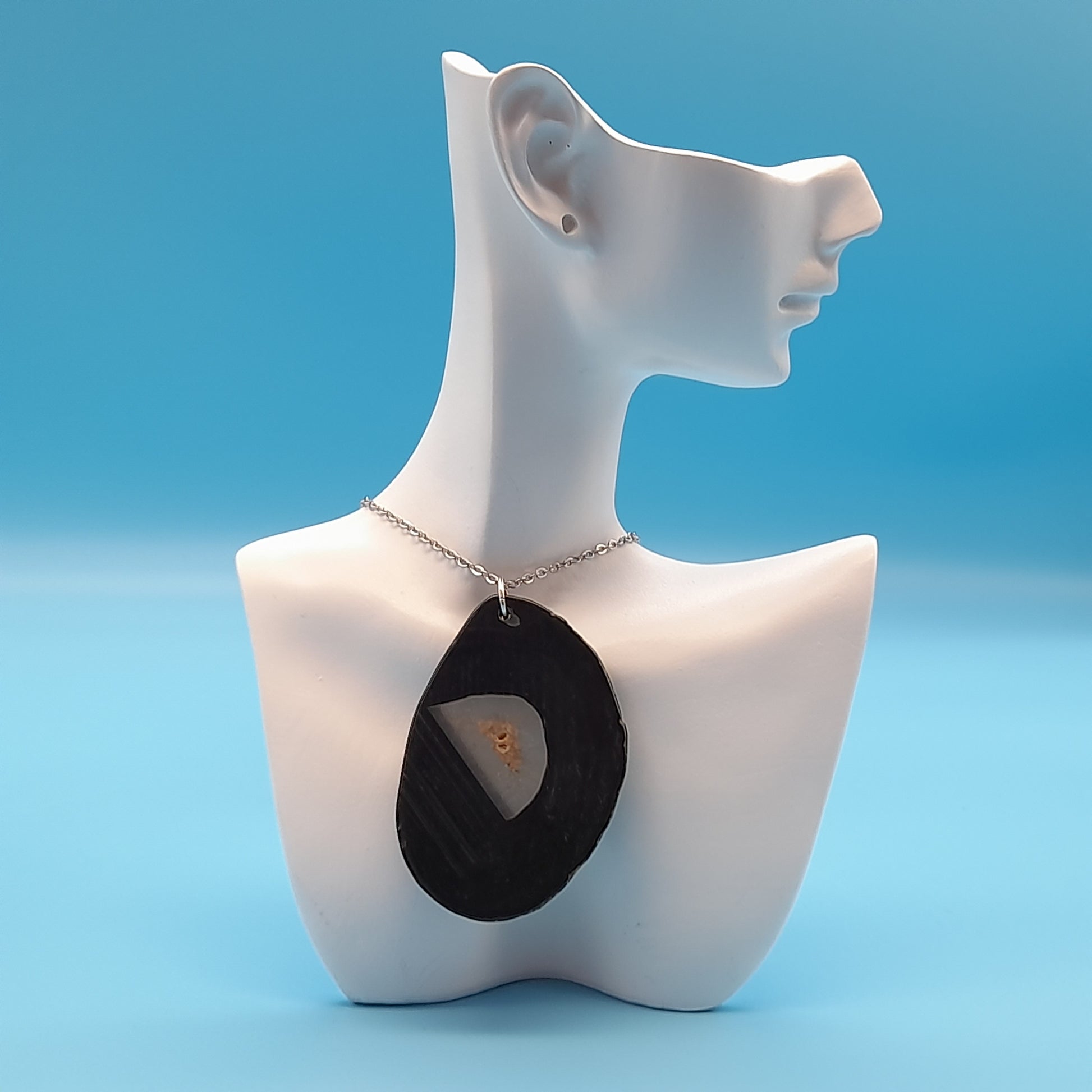 Découvrez ces charmants COLLIERS ornés d'une belle TRANCHE de PIERRE SEMI-PRÉCIEUSE D'AGATE RUBANÉE (rayée) en guise de pendentif. Pierre plutôt TRANSLUCIDE, polie au toucher lisse, avec par endroits le contour naturel de la géode d'origine dans laquelle, chaque agate a été délicatement coupée. Sa couleur principale est le NOIR & GRIS (teinte plus ou moins prononcée selon modèles, voir photos) avec quelques nuances naturelles de BEIGE, BLANC...