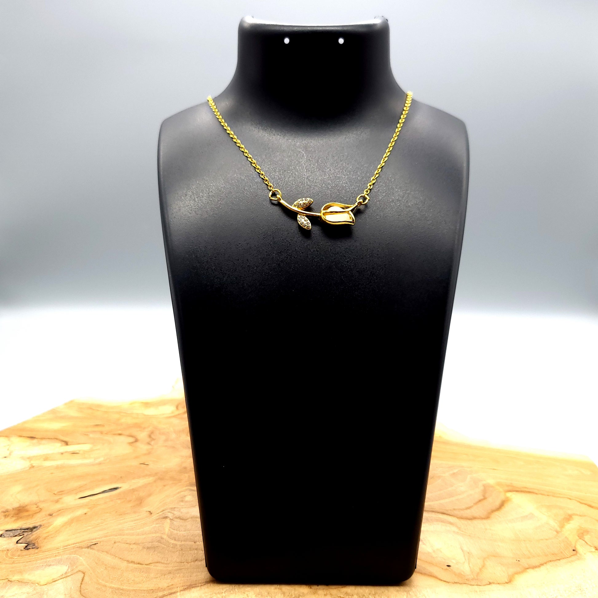 Apportez une touche florale avec cette CHAÎNE DORÉE ornée d'une FLEUR BOUTON de ROSE (ou tulipe !) avec des STRASS sur ses feuilles. Une bille blanche PHOPHORESCENTE est incrustée à l'intérieur (qui chargée de lumière, s'illumine dans le noir).