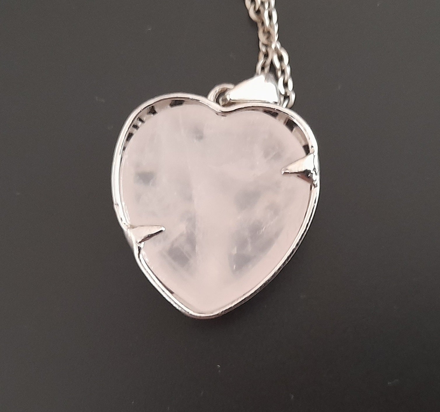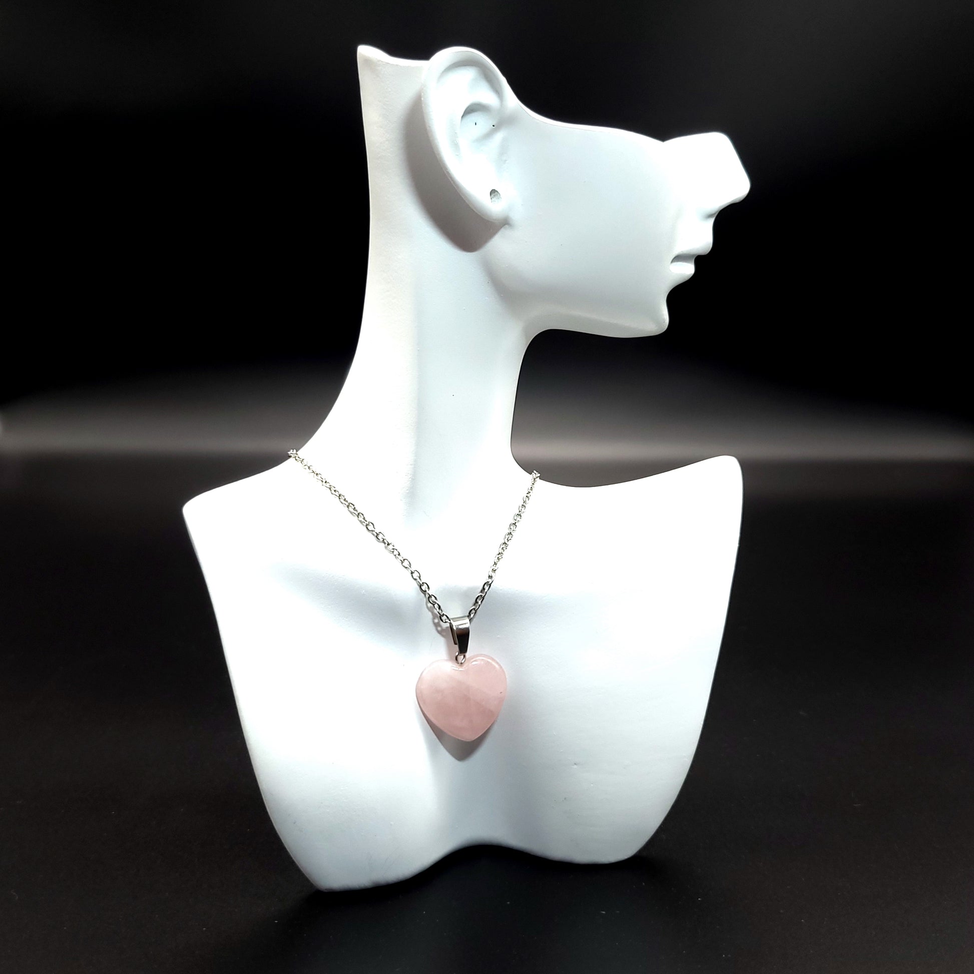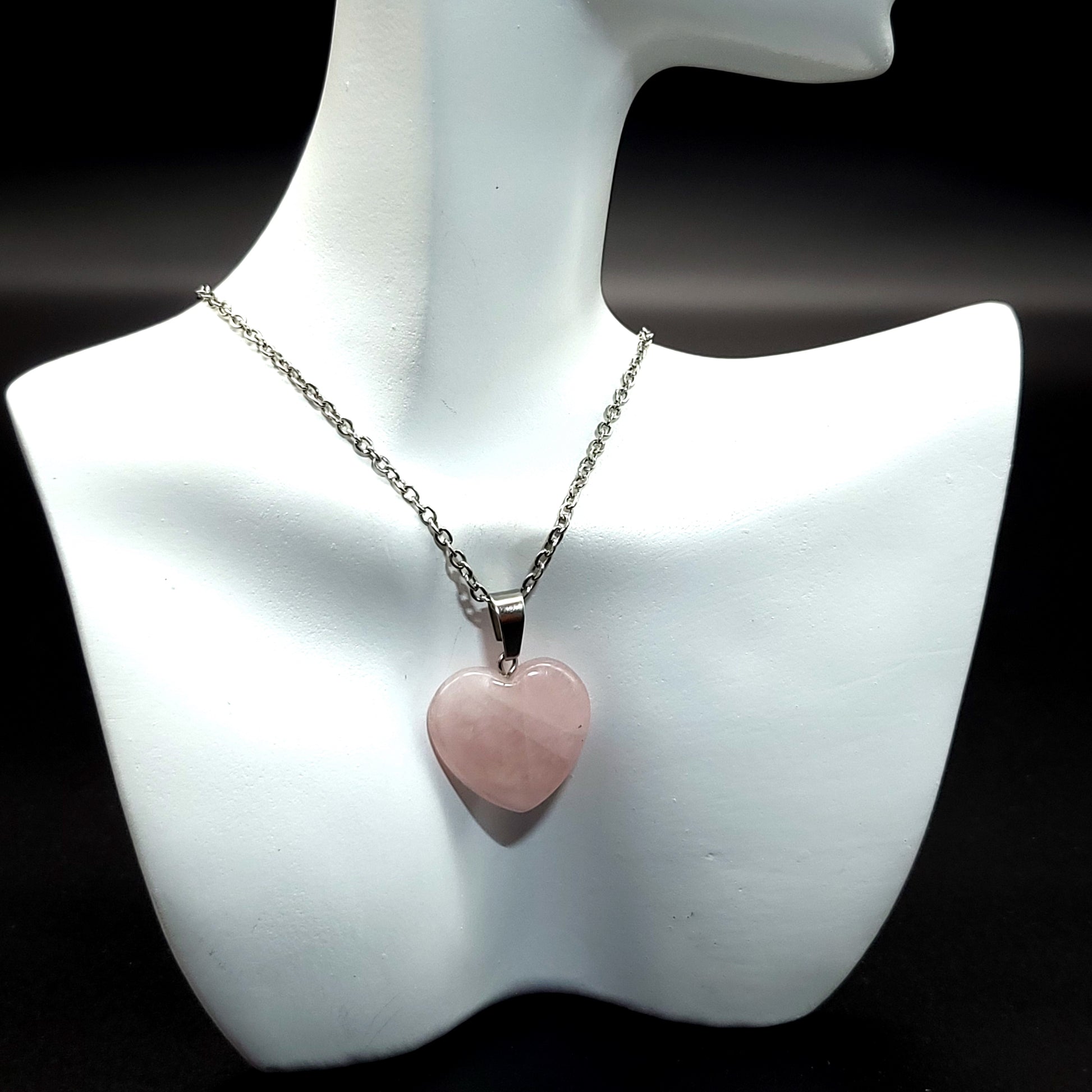 Découvrez ces 2 sublimes versions de COLLIERS avec, chacun un PENDENTIF en forme de CŒUR. Ils sont ornés d’une PIERRE NATURELLE SEMI-PRÉCIEUSE de QUARTZ ROSE, aux nuances brillantes uniques (coloris rose tendre semi opaque). Chaque pendentif est monté sur une CHAÎNE argentée en acier inoxydable (hypoallergénique), pour offrir confort et qualité. Colliers mixtes vendus à l'unité, convenant aussi bien aux femmes qu'aux hommes.