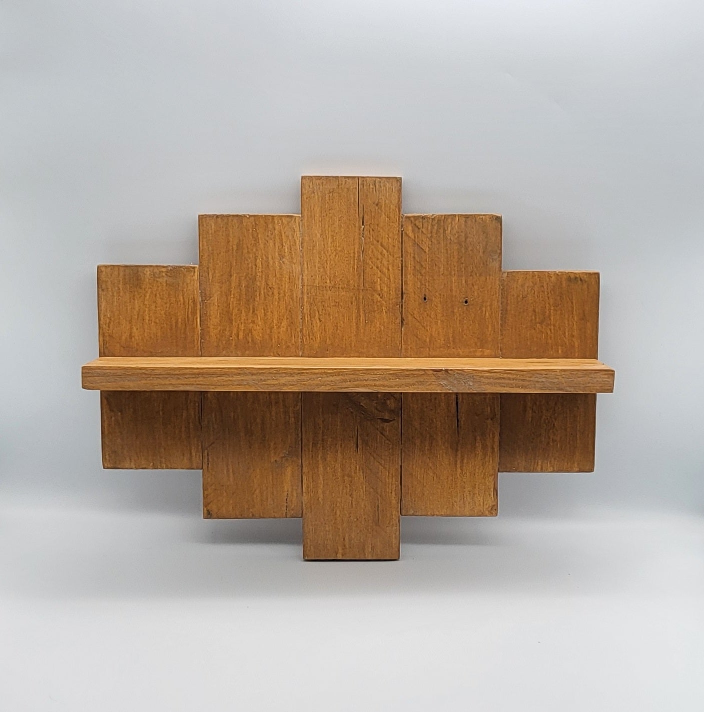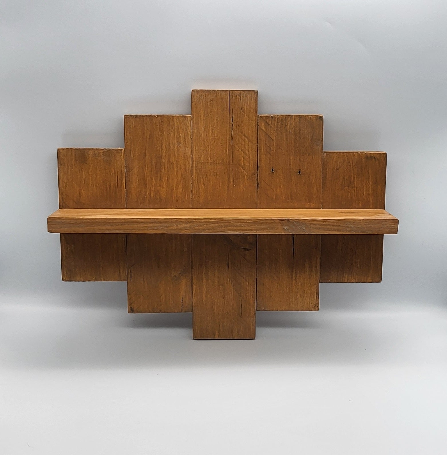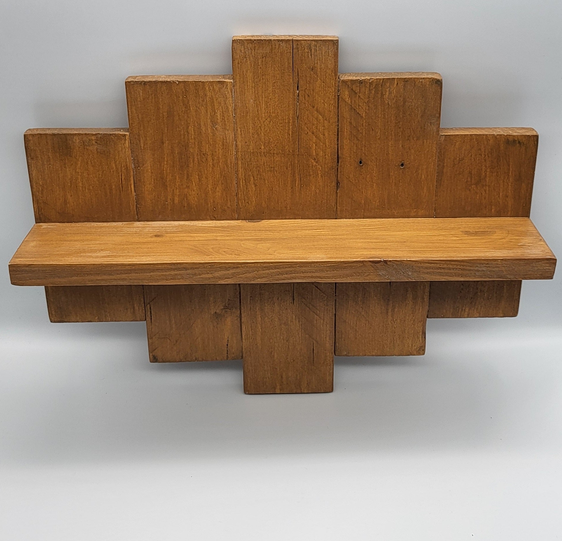 Ajoutez une touche de décoration originale et vintage à votre intérieur avec cette superbe ÉTAGÈRE MURALE esprit "DÉCALÉ" (haut + bas) en BOIS de palette recyclée. Elle possède une TABLETTE et offre par sa forme un "effet miroir", minutieusement réalisé de droite à gauche AUSSI. Composée de 5 lames de palettes choisies + lasure de protection.