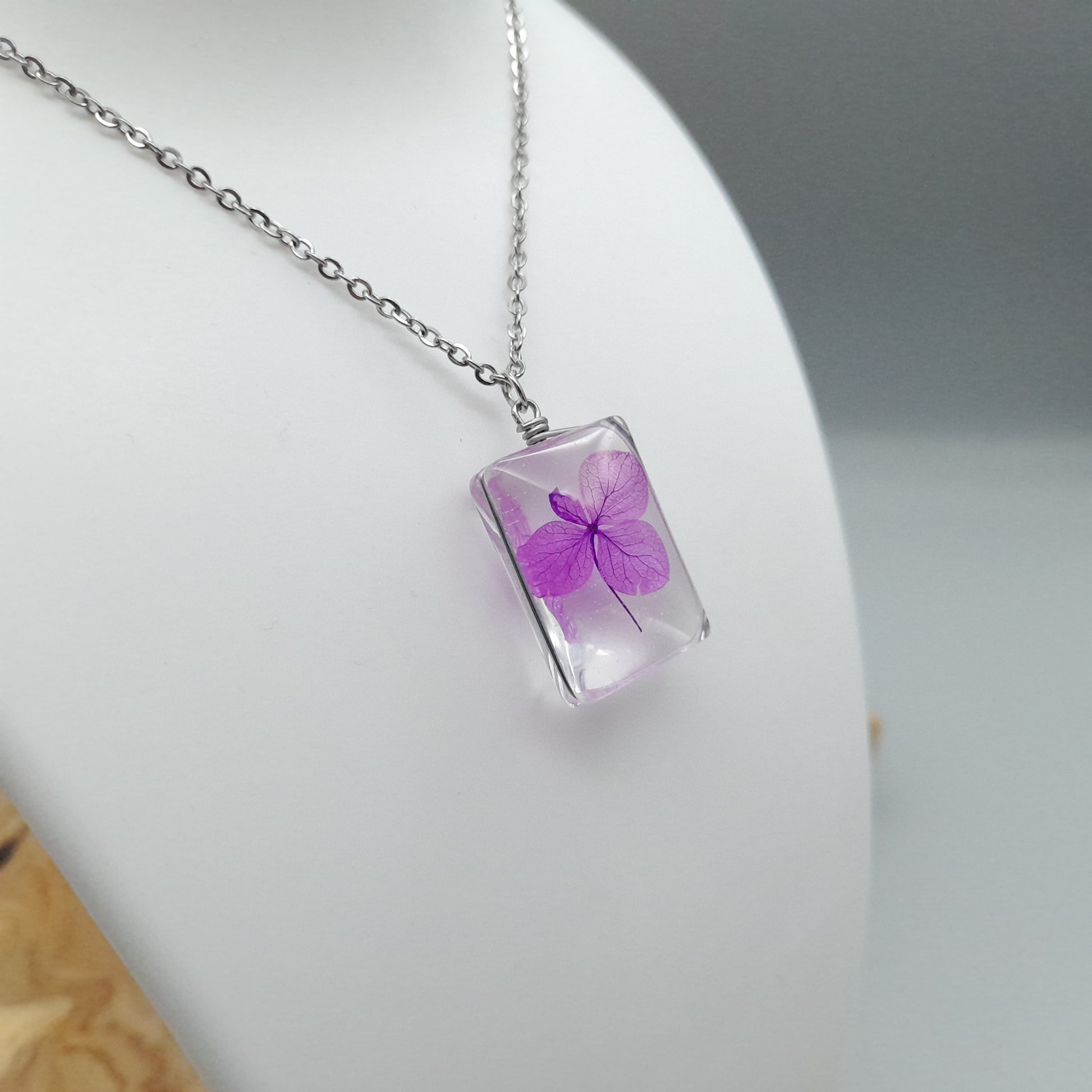 Laissez-vous tenter par l'un de ces COLLIERS " ESPRIT NATURE à FLEURS ". Ils sont ornés d'un magnifique pendentif mettant en valeur de VRAIES FLEURS SÉCHÉES au choix (Hortensia, Rhododendron, Sauge, Pélargonium...) glissées avec minutie au milieu de 2 cabochons en verre bombés (ovales, rectangulaires...). L'ensemble est souligné d'un cerclage avec un fil métallique, pour une belle finition soignée. Chaque fleur est différente et UNIQUE par nature ! Ce qui rajoute beaucoup de charme à ces colliers.