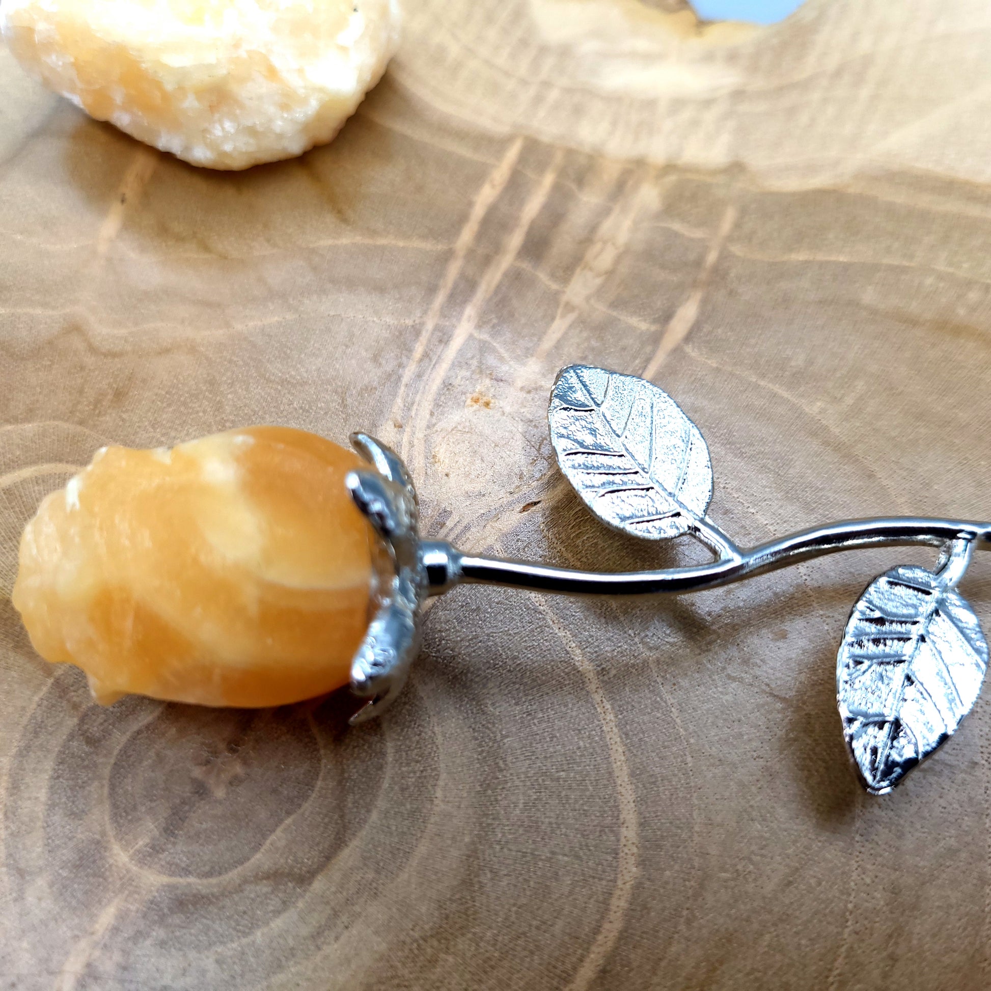 Si vous aimez la NATURE et les FLEURS, alors vous allez adorer ces ROSES en PIERRE SEMI-PRÉCIEUSE en CALCITE JAUNE, aux nuances brillantes semi opaques (coloris jaune, blanc avec de belles nuances). Ces roses ont été sculptées en forme de « boutons » ; les pétales ont des reliefs. Les tiges maintenant les roses ont été étudiées pour mettre parfaitement en valeur chaque fleur. Elles sont conçues en métal argenté, donc solides et rigides, elles possèdent 2 feuilles striées, décalées sur la tige. Les détails et les reliefs sont magnifiques et très réalistes.