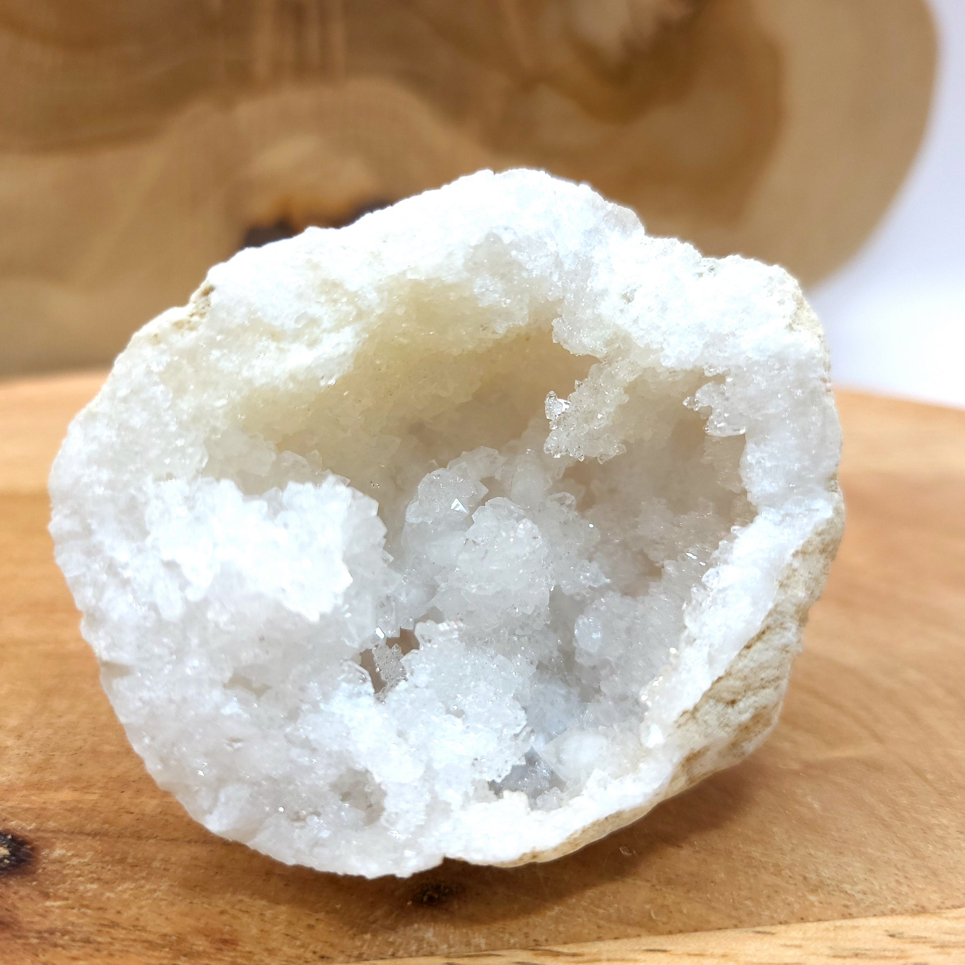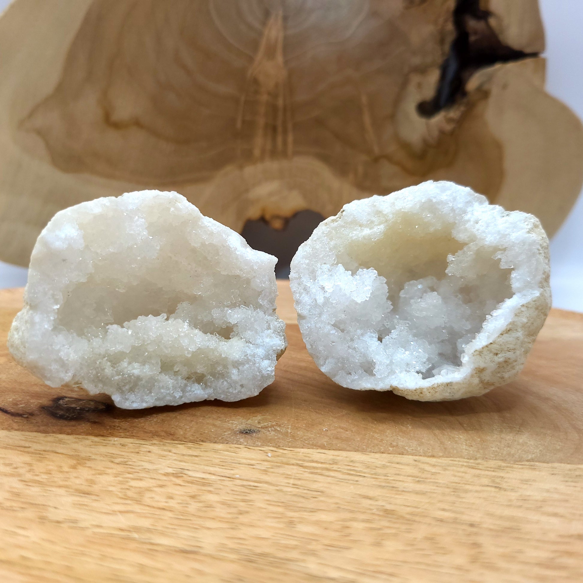 Chacune possède des cristaux des 2 cotés, avec des facettes, un jeu de transparences et nuances blanches, avec des cristaux irréguliers, ce qui lui confère toute sa splendeur. Vendues à l’unité (en lot de 2 parties), à choisir parmi les différentes géodes et tailles proposées ici.