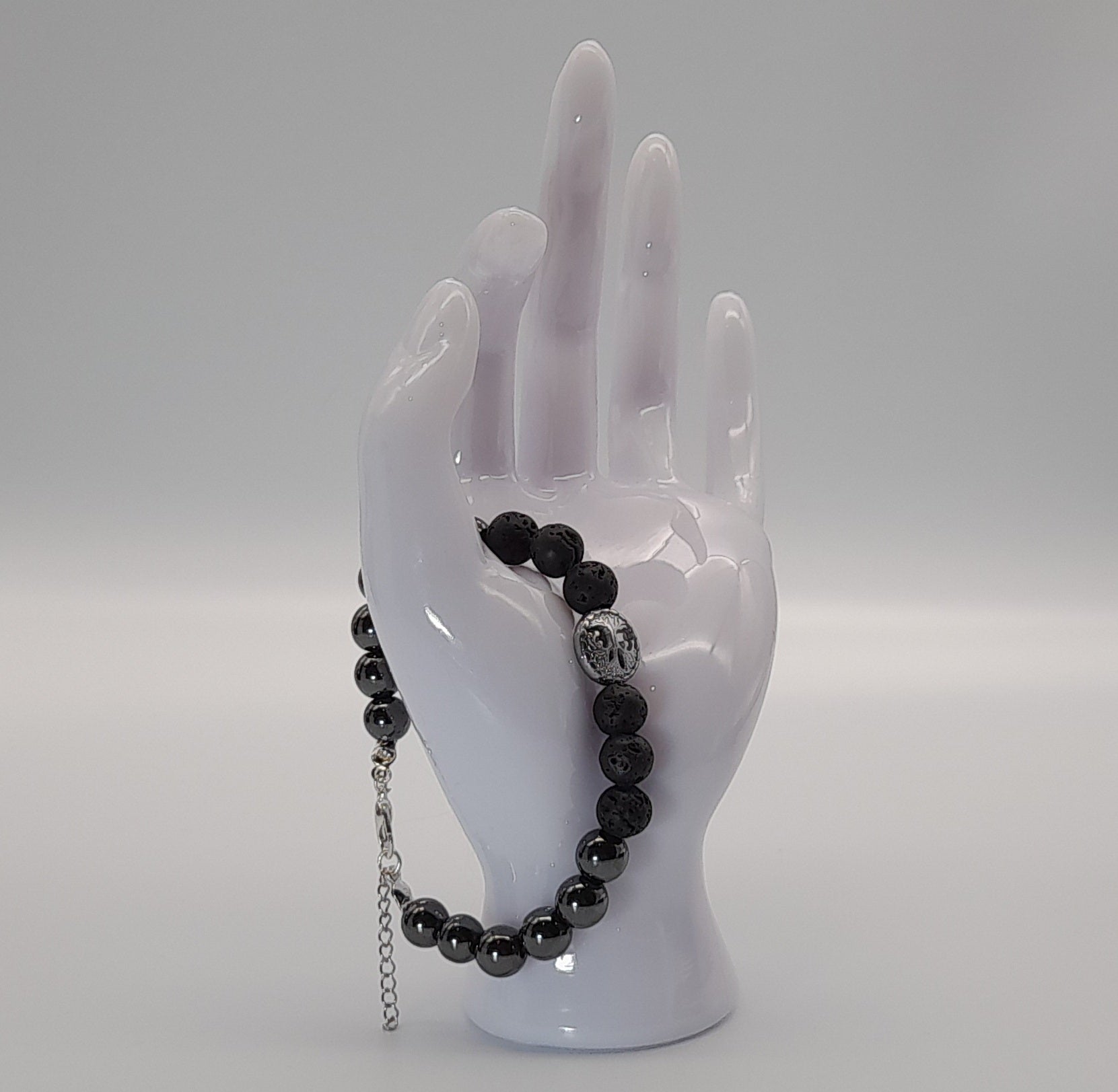 Découvrez ce joli BRACELET, orné d'une magnifique PERLE AJOURÉE sculptée en ARBRE de VIE en HÉMATITE. Il est entouré d'un DUO de PERLES en PIERRES NATURELLES SEMI-PRÉCIEUSES D'HÉMATITE (coloris gris anthracite opaque, texture très métallisée) et de PIERRE de LAVE (coloris noir, gris anthracite opaque, texture de mini cratères).
