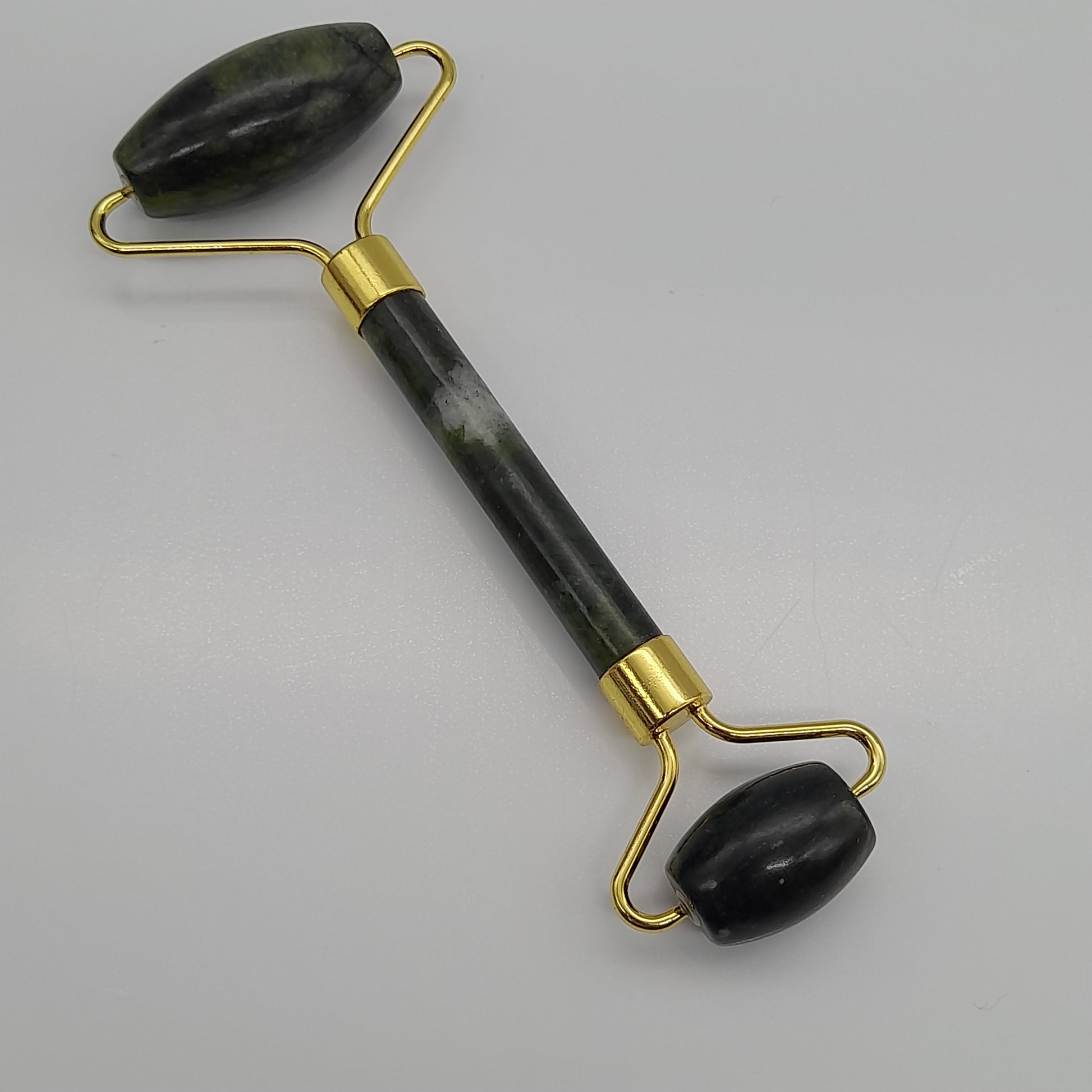 Adoptez ce sublime outil astucieux SCULPTÉ composé de 2 ROULEAUX de MASSAGE en PIERRE SEMI-PRÉCIEUSE de JADE (coloris vert foncé opaque, marbré de nuances noires...). Un large rouleau d’un côté et un moyen de l’autre (tailles standards). C’est un accessoire de beauté joli et étonnant, au toucher lisse très agréable, qui glisse sur la peau avec douceur. L’ensemble est solide car les pierres sont fixées grâce à du métal (doré).