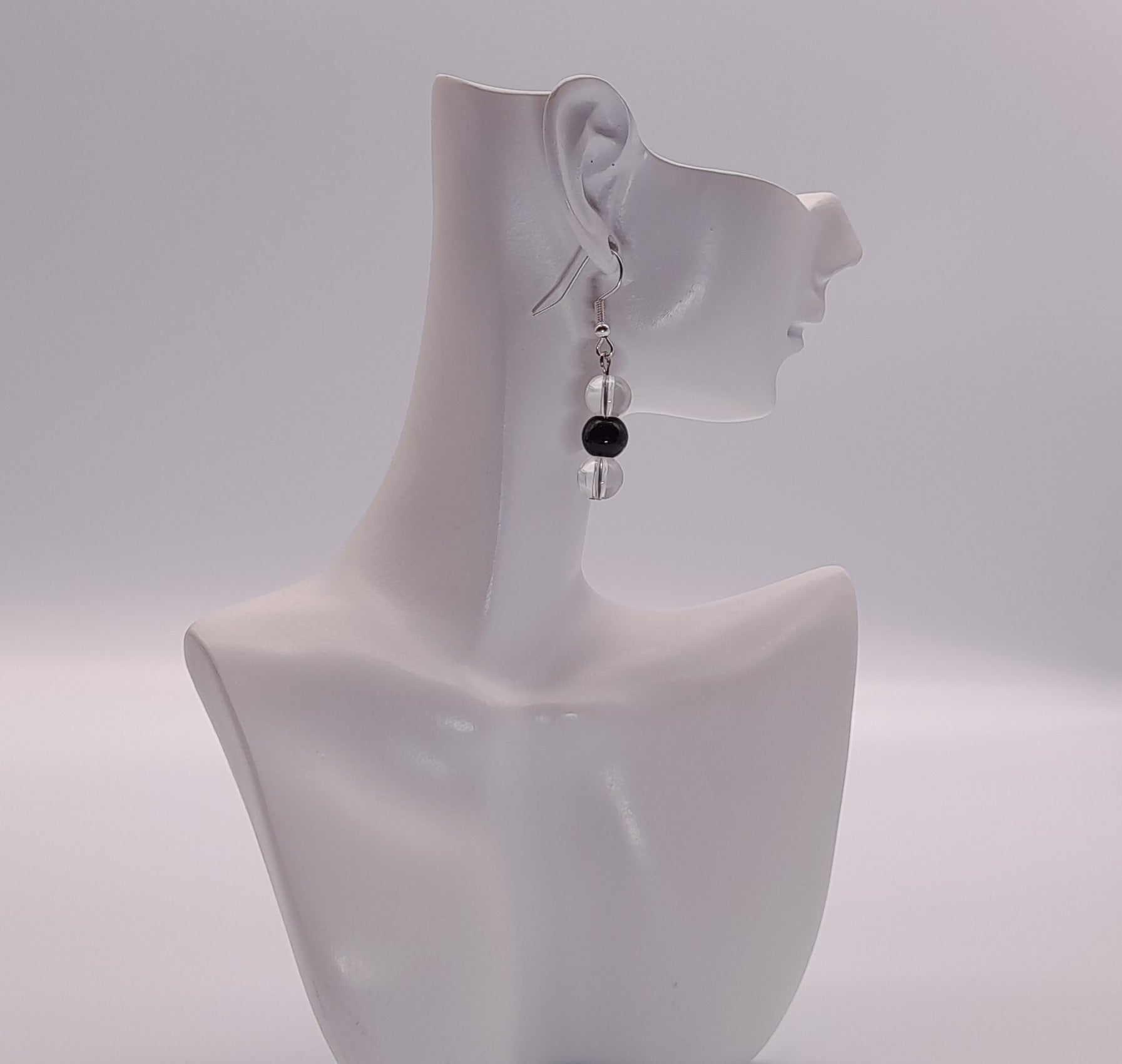 Adoptez ces jolies BOUCLES D'OREILLES de PERLES RONDES en DUO de PIERRES NATURELLES SEMI-PRÉCIEUSES D'ONYX NOIR et de CRISTAL de ROCHE, aux nuances brillantes uniques (coloris noir opaque et coloris "blanc" transparent). Elles sont composées de 3 PERLES RONDES pour créer douceur et harmonie. Et si ça vous dit, ce modèle est idéal pour se marier avec nos chaines à perles ici et ou bracelets là du même style !