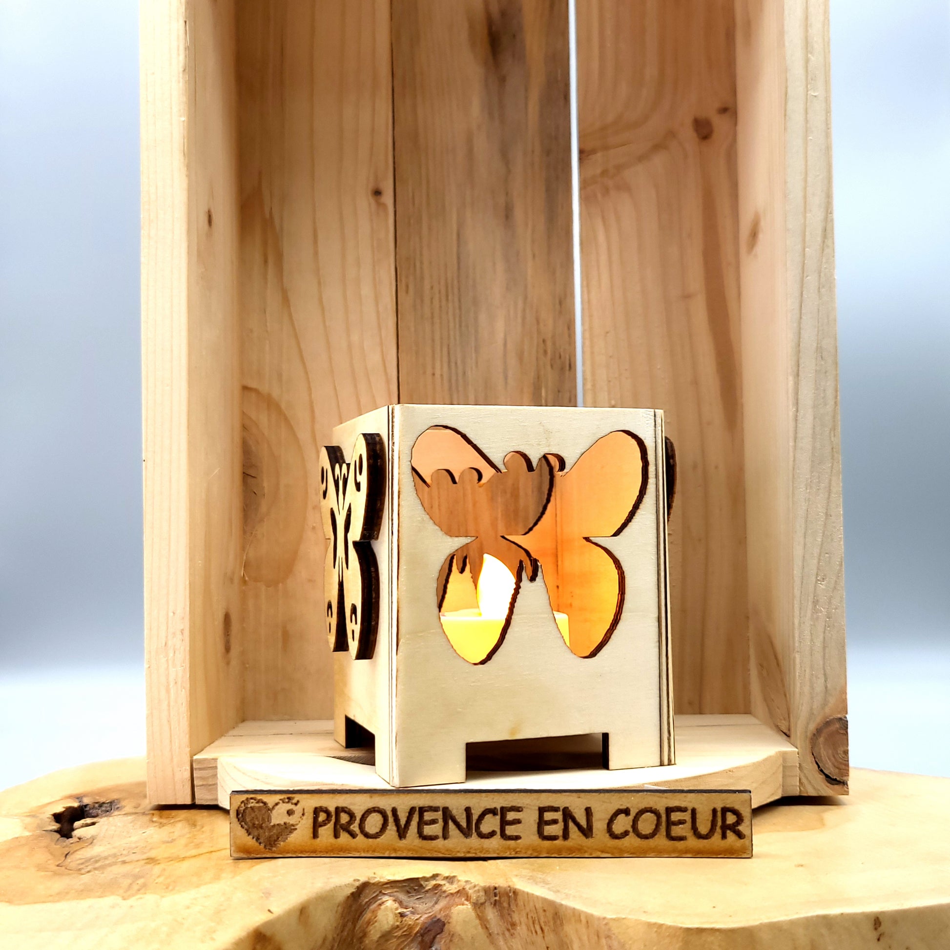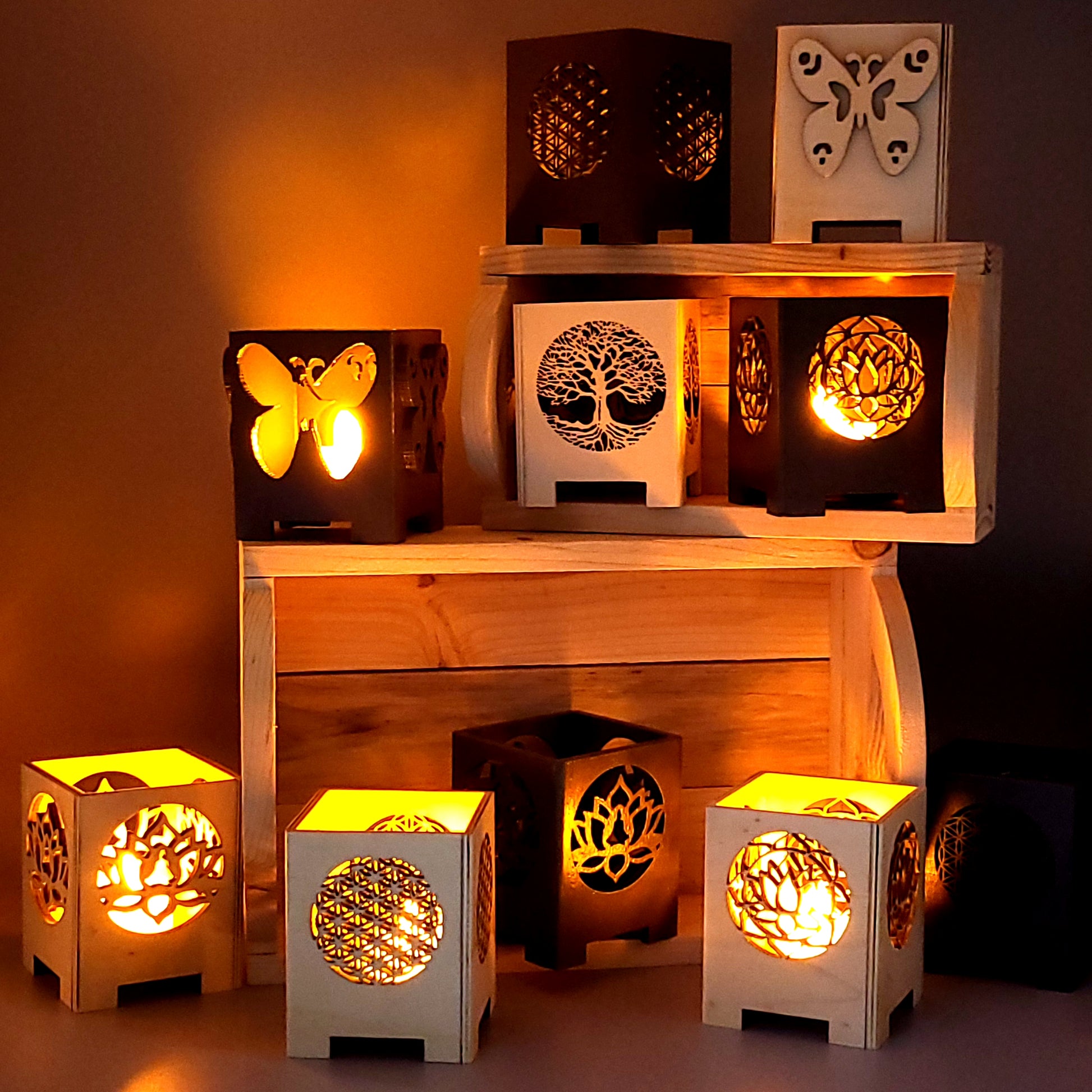 PHOTOPHORES EN BOIS NATUREL + VERNIS + BOUGIES COEUR - DIVERS MODÈLES (ARBRE DE VIE, PAPILLON...) - UNIQUES, ORIGINAUX & ARTISANAUX