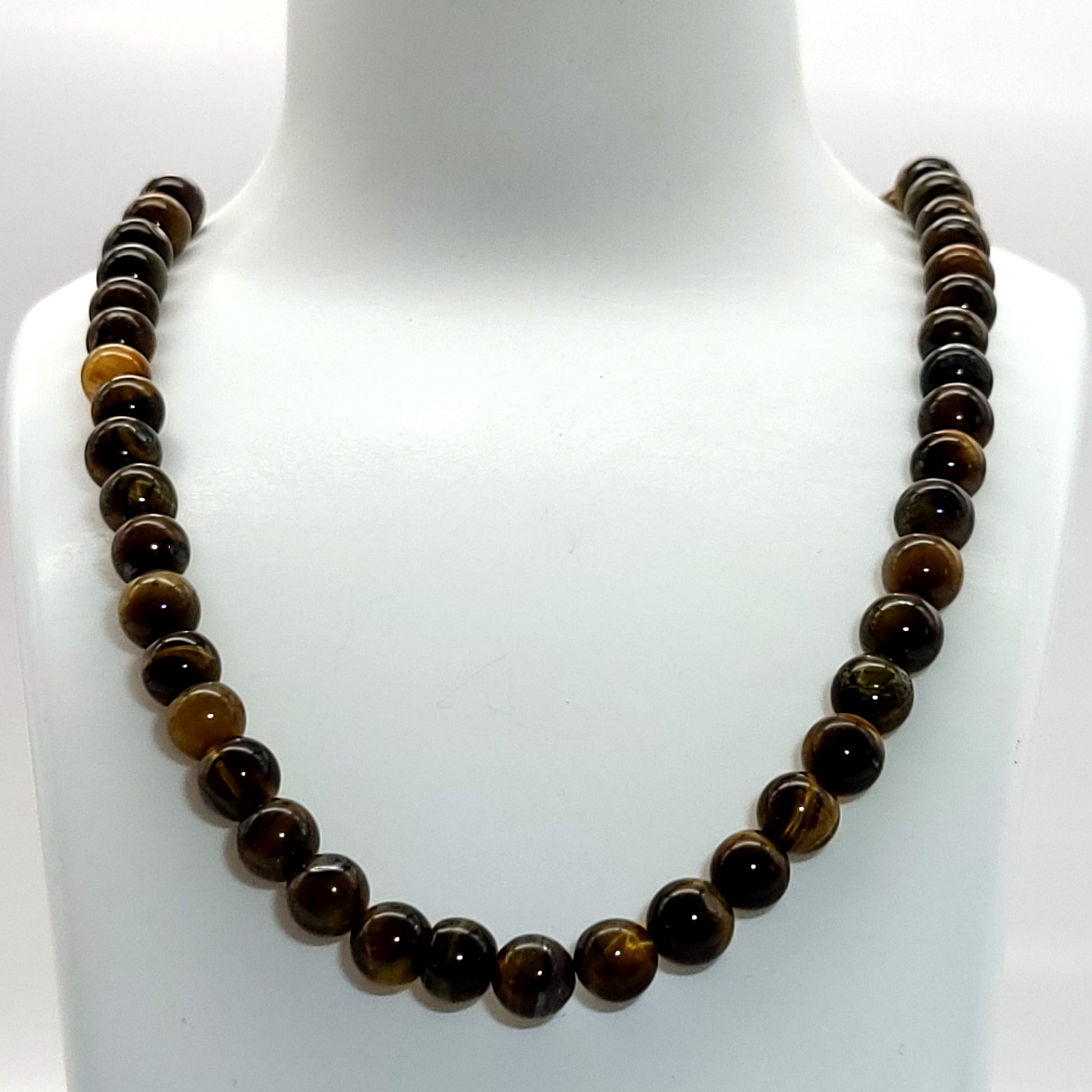 GRAND COLLIER COMPLET DE PERLES RONDES EN PIERRE OEIL DU TIGRE - BIJOU ARTISANAL & UNIQUE