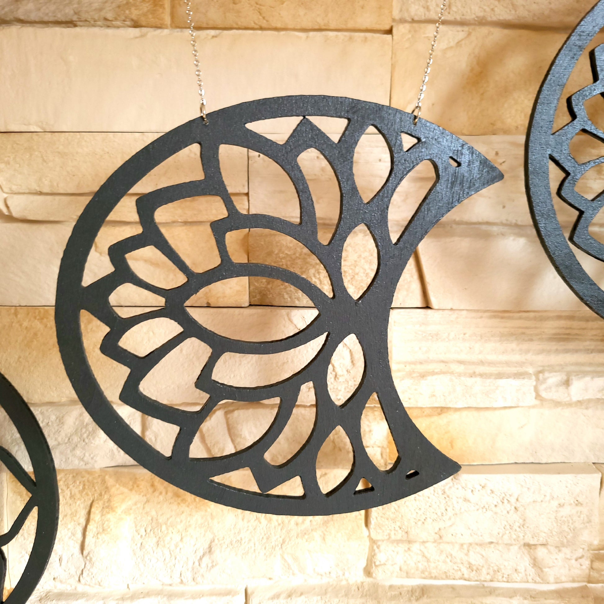La pleine lune (au centre est légèrement en retrait pour faire un effet de profondeur) et ses croissants évolutifs (lunes montantes et descendantes de chaque coté) sont aussi en bois, aux motifs de FLEURS de LOTUS. C'est sublime, on dirait de la dentelle de bois !