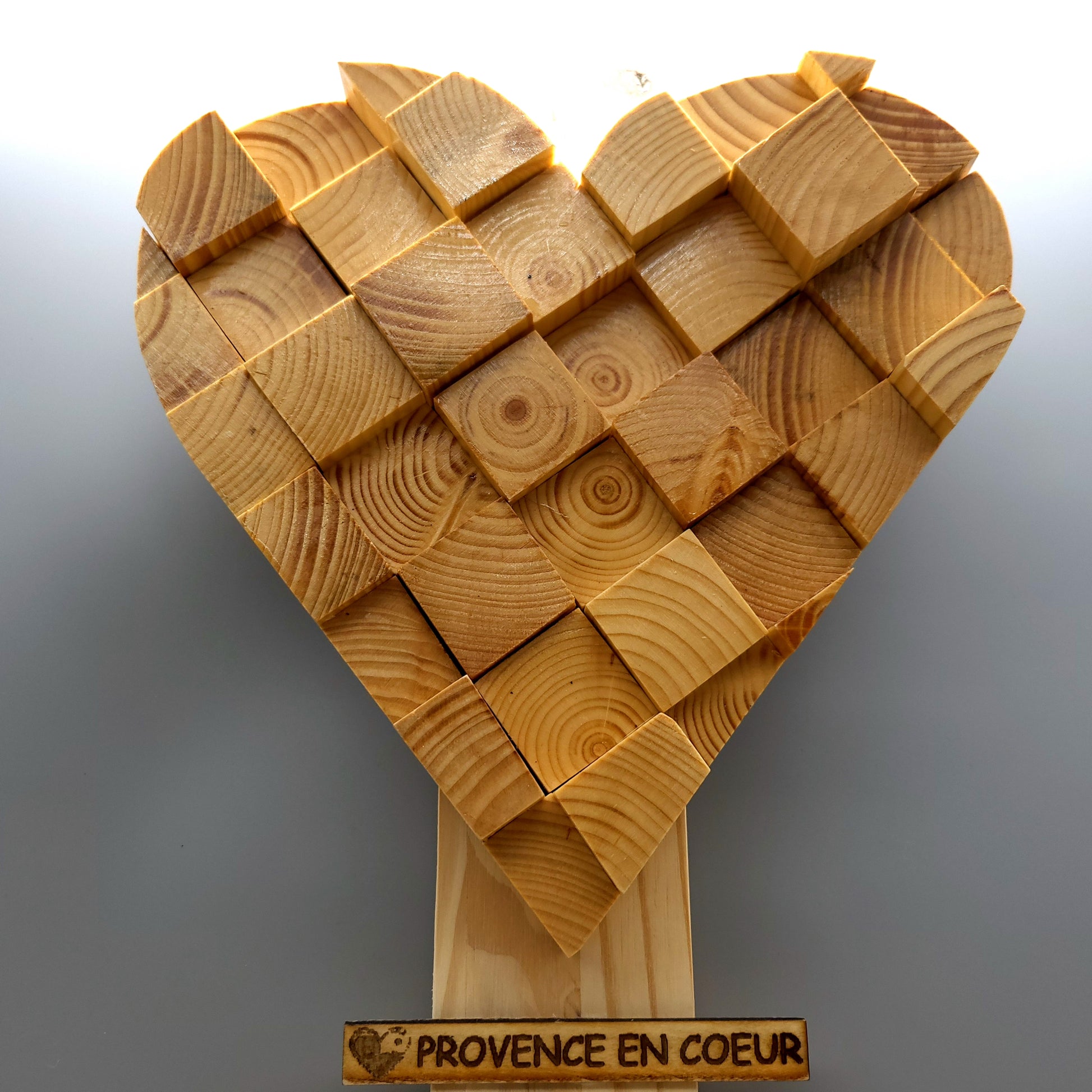 Admirez la beauté et l’originalité de cette œuvre ! Voici un de nos TABLEAUX en 3D DÉCORATIFS entièrement réalisés avec des PUZZLES en BOIS (fabriqués 100 % par nos soins). Ceux là sont de formes CUBIQUES (posés en diagonales !) sur une BASE de COEUR, avec une finition VERNIE. Cela met en valeur les nervures et les hauteurs.