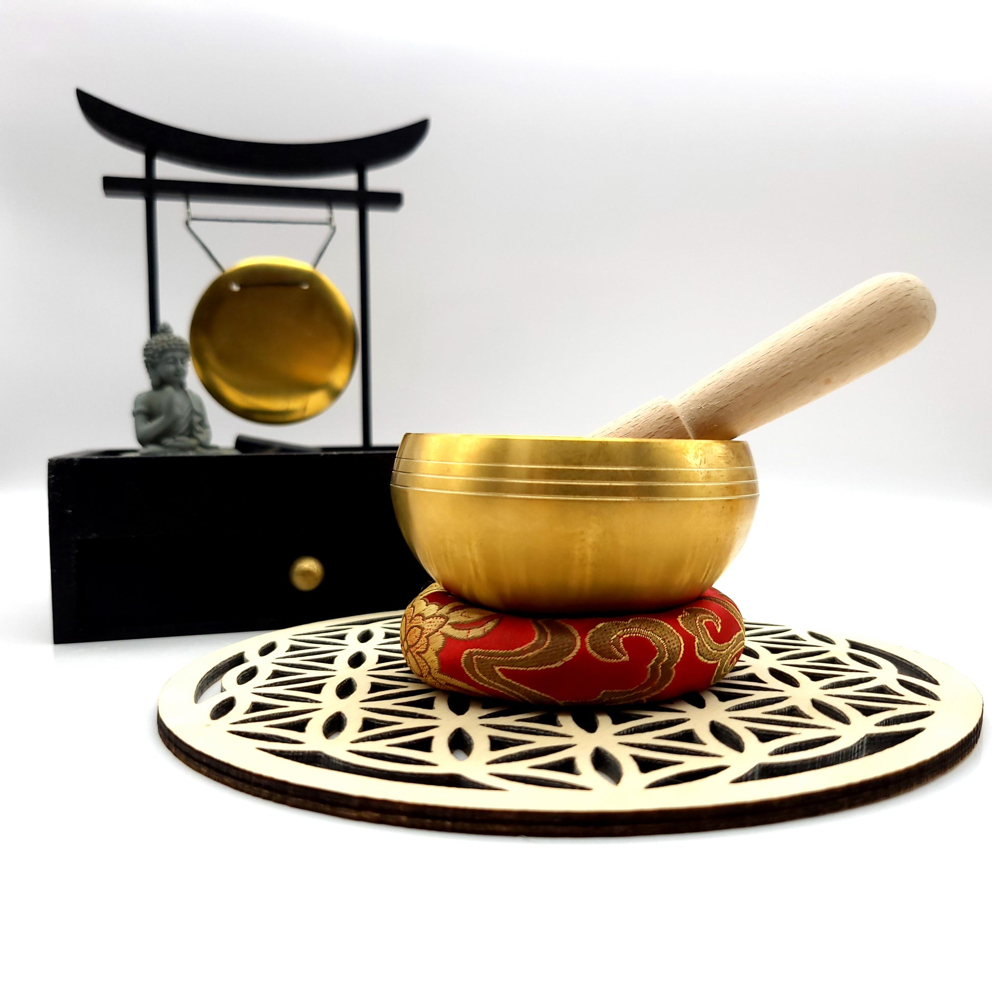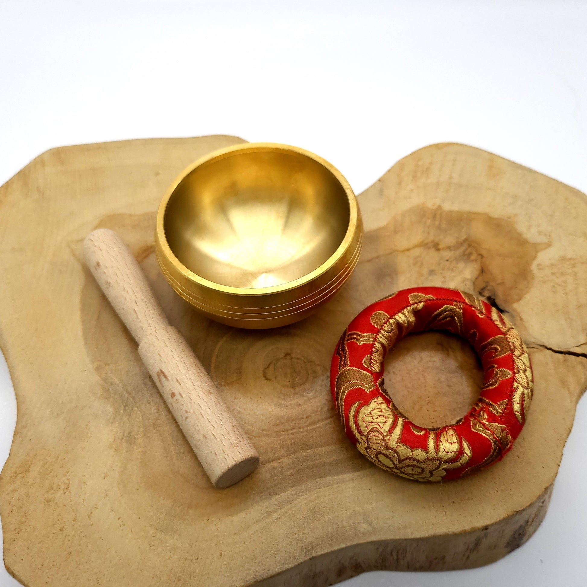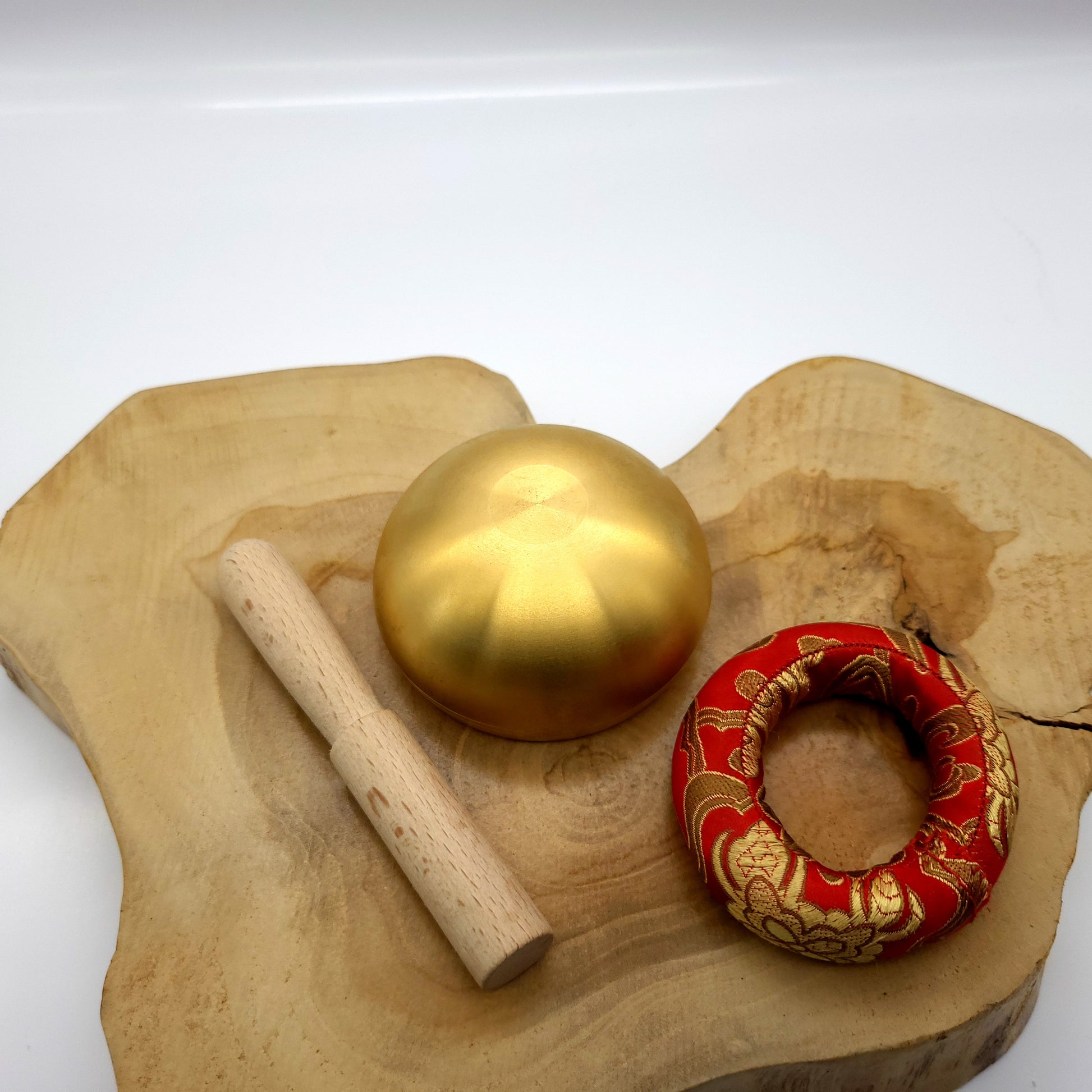 N°1 : Bol doré lisse, 3 cercles gravés, coussin rouge + doré, bâton (bois), sans étui.