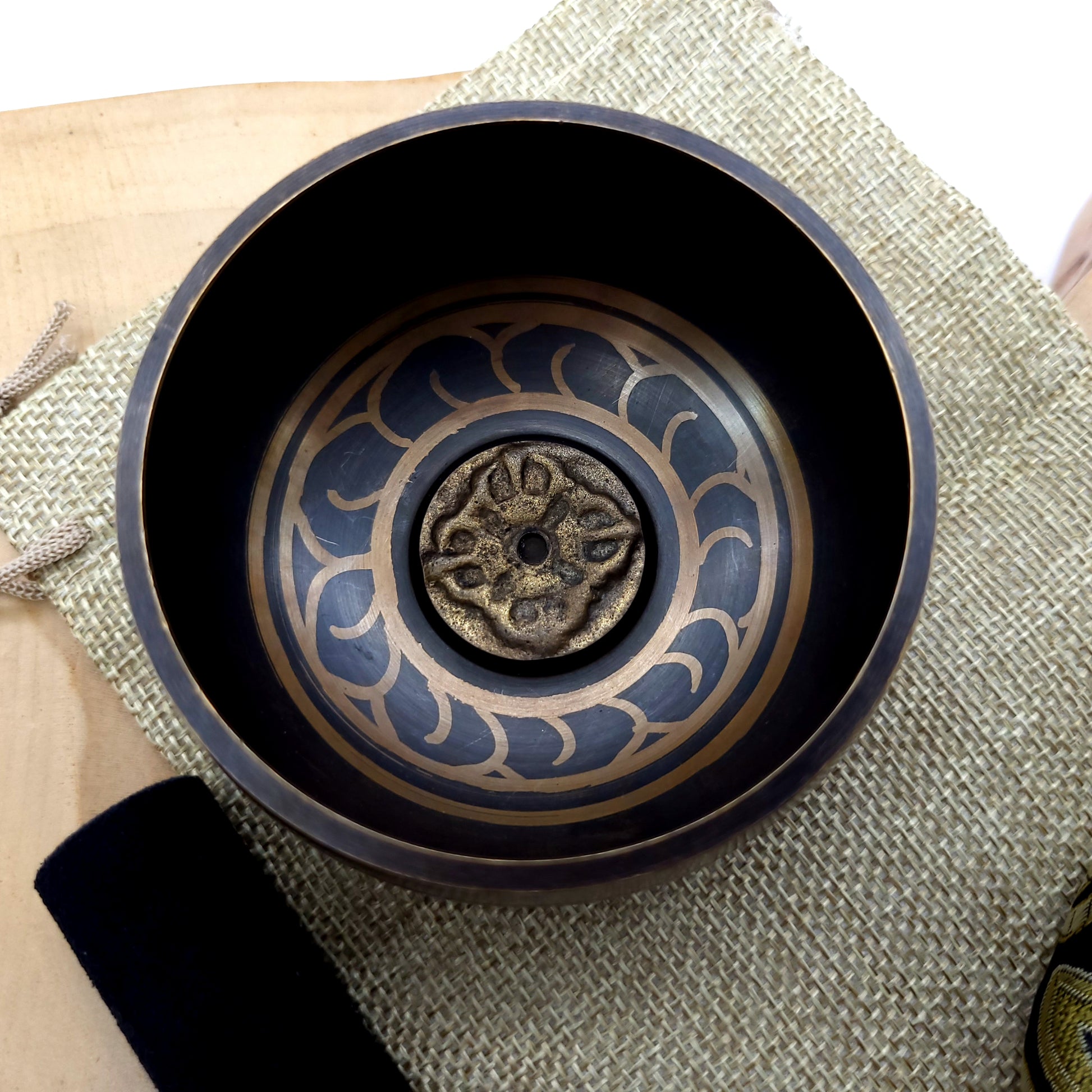 N°2 : Bol gravé de dessins dorés sur fond noir + 3 cercles gravés, coussin noir & doré, bâton (en cuir + bois), avec grand étui de rangement en lin beige.