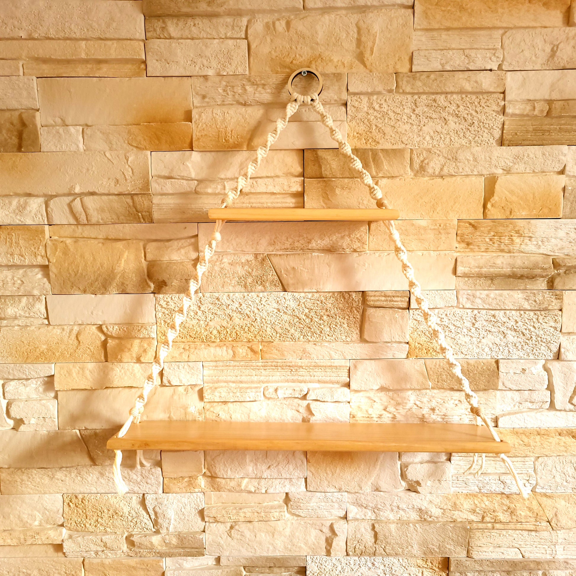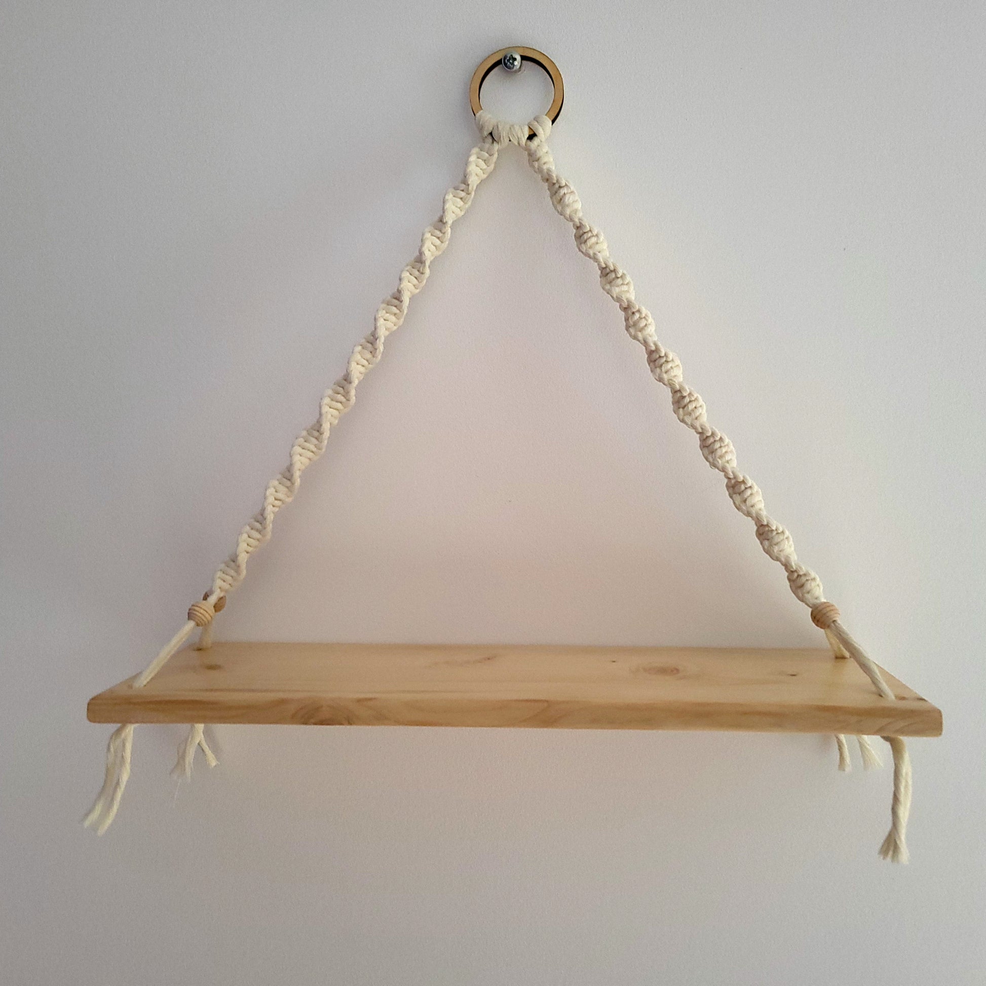 Offrez vous une déco atypique unique en son genre ! Voici plusieurs modèles D’ÉTAGÈRES en version BALANÇOIRES, où l’on a réussi à associer l’art du BOIS et celui du MACRAMÉ ! Des ÉTAGÈRES en BOIS NATUREL, finitions vernis protecteur transparent. Des versions simples et doubles, petites, moyennes et grandes, avec des nœuds torsadés et/ou droits, Kuminimos (...) à base de fils de coton de qualité coloris BLANC ÉCRU UNI. Ces balançoires aux bords biseautés (4 cotés, dessus et dessous) sont aussi décorées de PERLES en BOIS coloris naturel, pour rester dans l’esprit Nature !