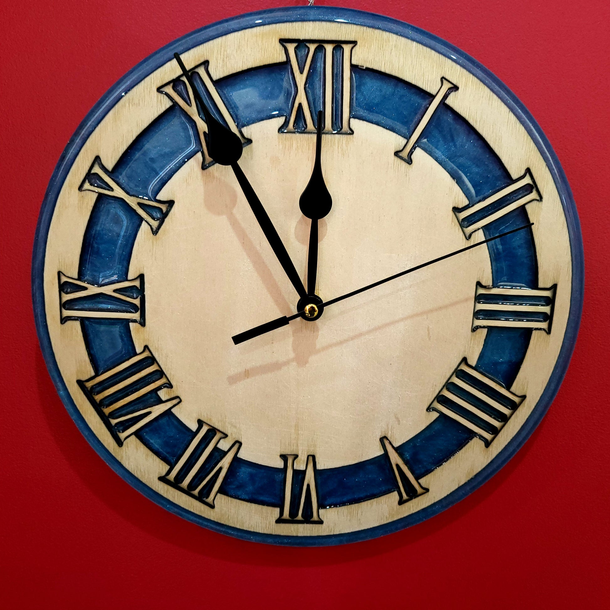 HORLOGE MURALE RONDE BLEUE VINTAGE EN BOIS & RÉSINE - DÉCORATION ARTISANALE, UNIQUE & ORIGINALE