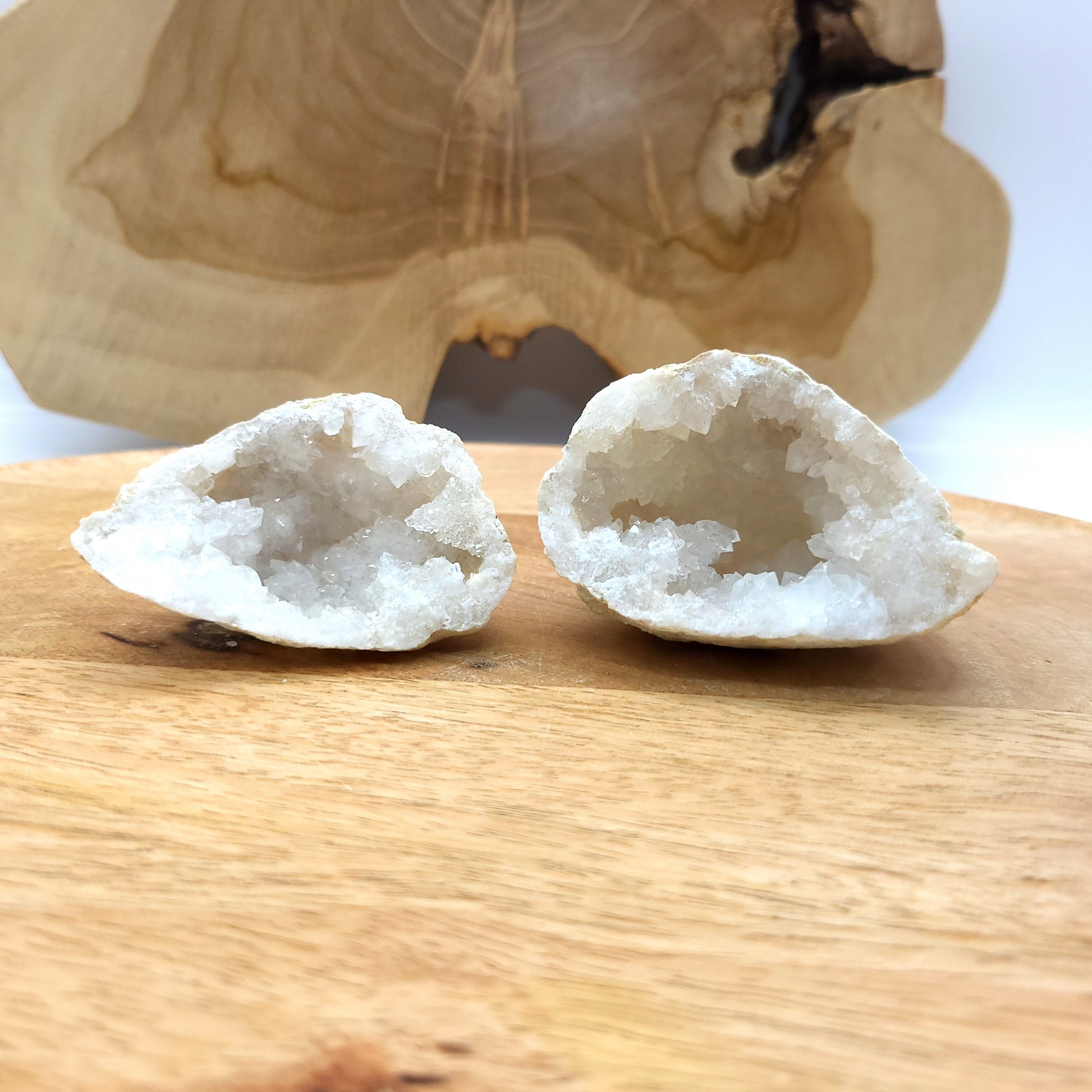Chacune possède des cristaux des 2 cotés, avec des facettes, un jeu de transparences et nuances blanches, avec des cristaux irréguliers, ce qui lui confère toute sa splendeur. Vendues à l’unité (en lot de 2 parties), à choisir parmi les différentes géodes et tailles proposées ici.