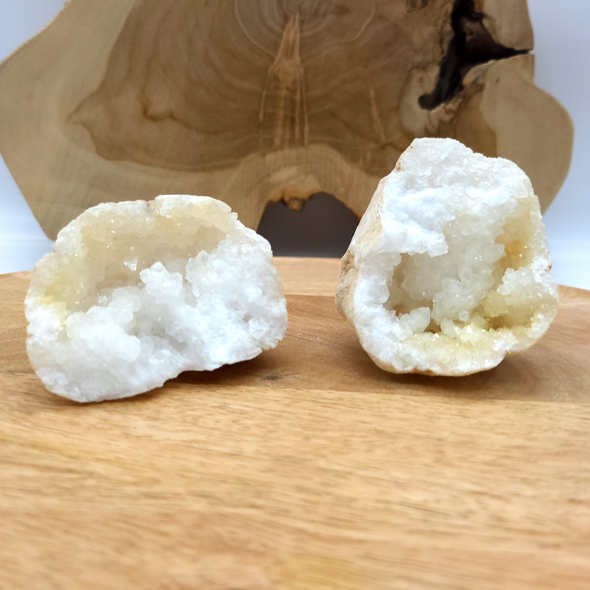 Chacune possède des cristaux des 2 cotés, avec des facettes, un jeu de transparences et nuances blanches, avec des cristaux irréguliers, ce qui lui confère toute sa splendeur. Vendues à l’unité (en lot de 2 parties), à choisir parmi les différentes géodes et tailles proposées ici.