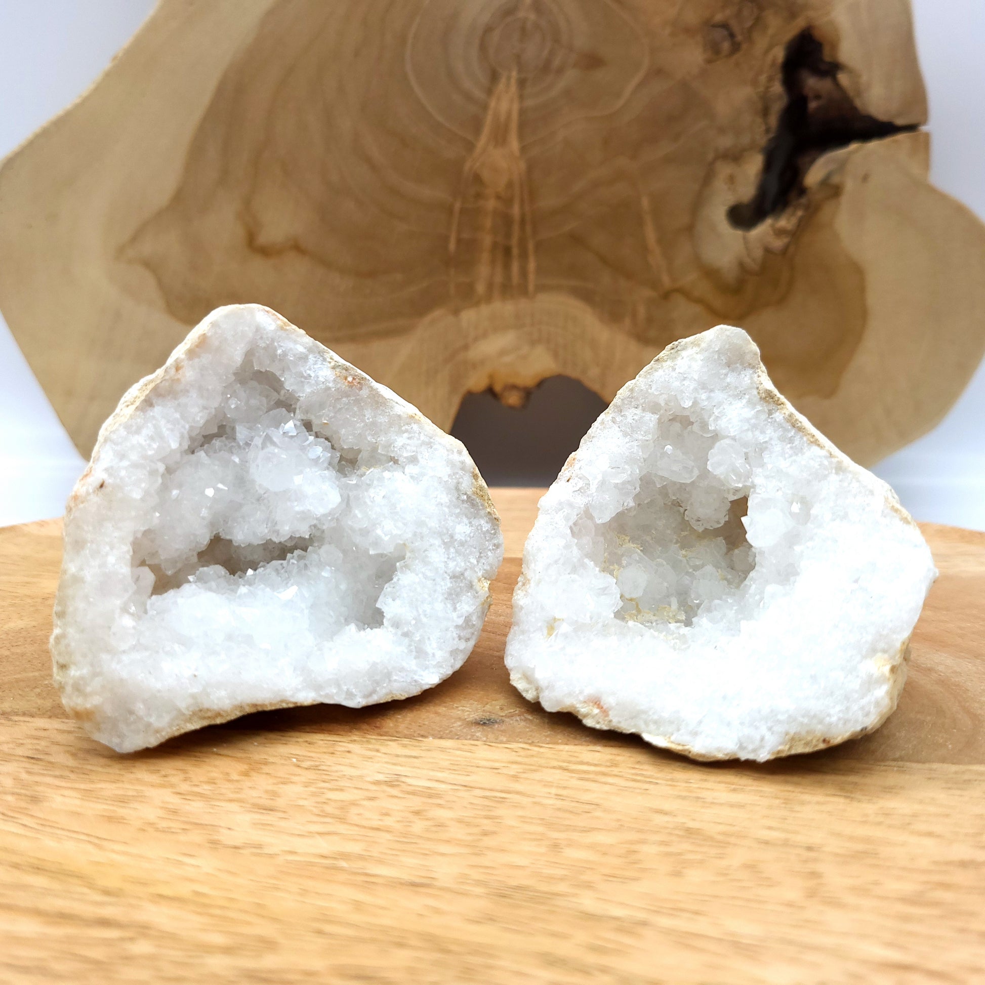Chacune possède des cristaux des 2 cotés, avec des facettes, un jeu de transparences et nuances blanches, avec des cristaux irréguliers, ce qui lui confère toute sa splendeur. Vendues à l’unité (en lot de 2 parties), à choisir parmi les différentes géodes et tailles proposées ici.