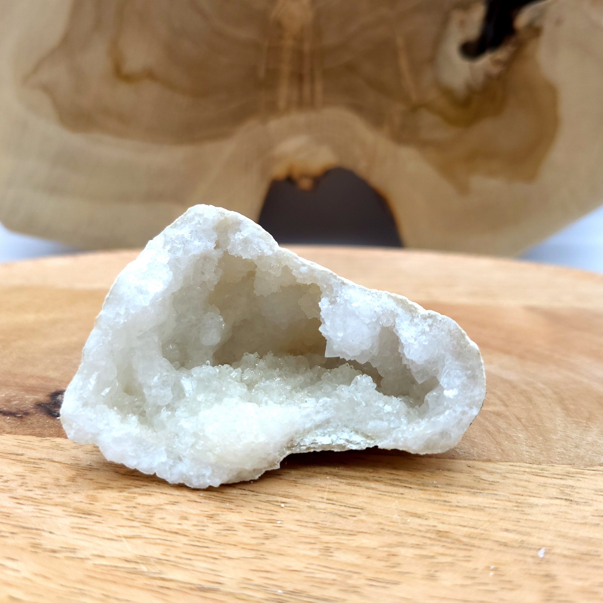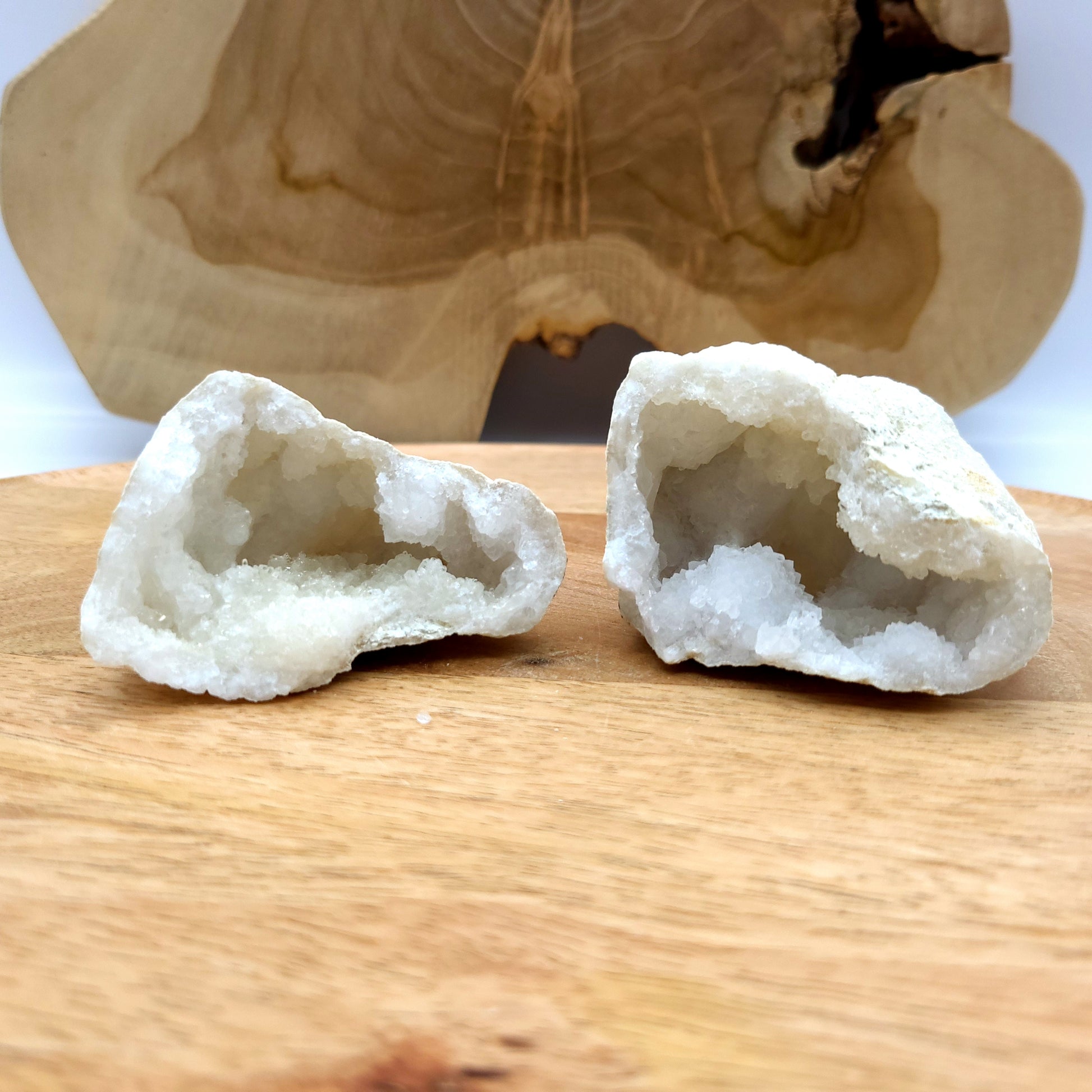 Chacune possède des cristaux des 2 cotés, avec des facettes, un jeu de transparences et nuances blanches, avec des cristaux irréguliers, ce qui lui confère toute sa splendeur. Vendues à l’unité (en lot de 2 parties), à choisir parmi les différentes géodes et tailles proposées ici.