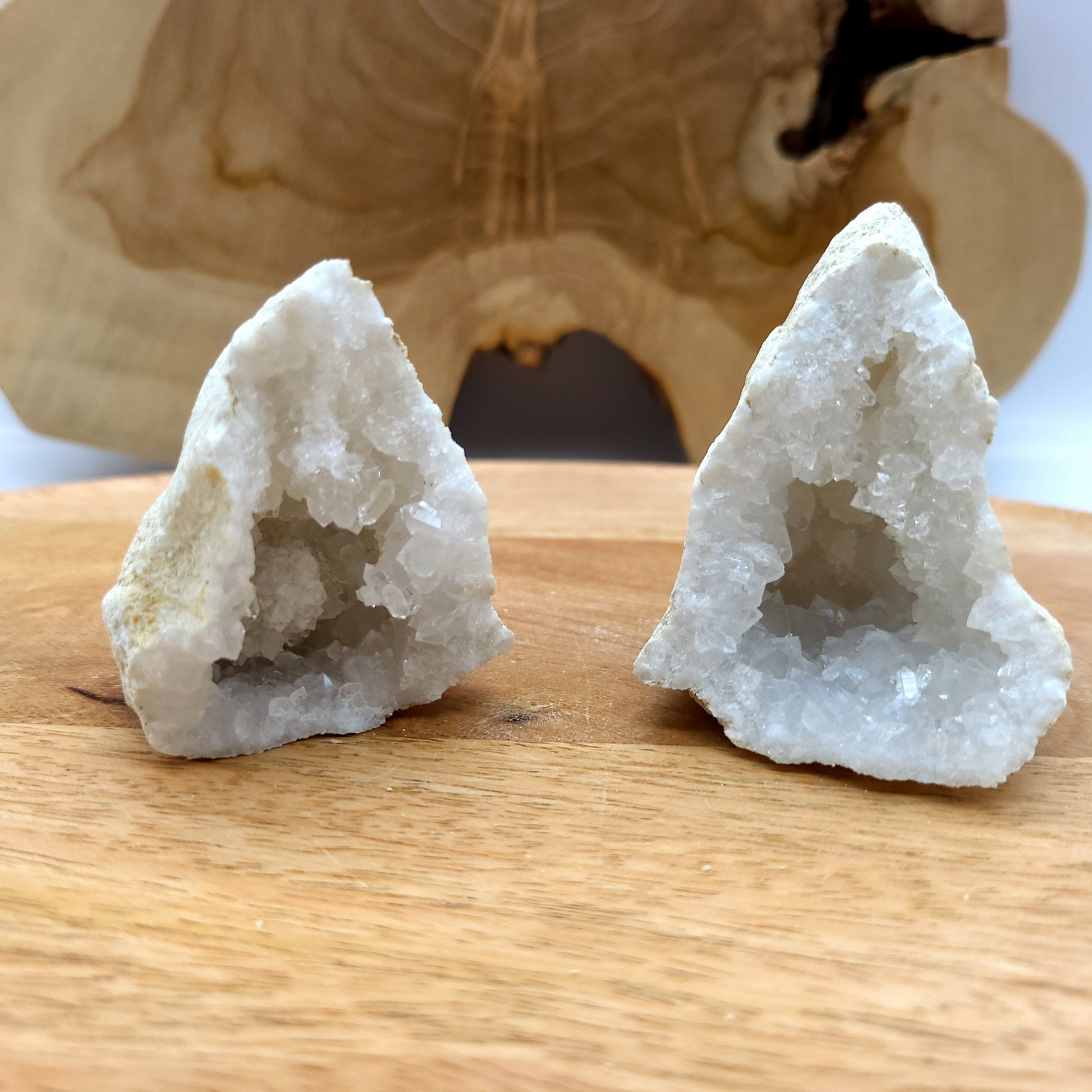 Chacune possède des cristaux des 2 cotés, avec des facettes, un jeu de transparences et nuances blanches, avec des cristaux irréguliers, ce qui lui confère toute sa splendeur. Vendues à l’unité (en lot de 2 parties), à choisir parmi les différentes géodes et tailles proposées ici.