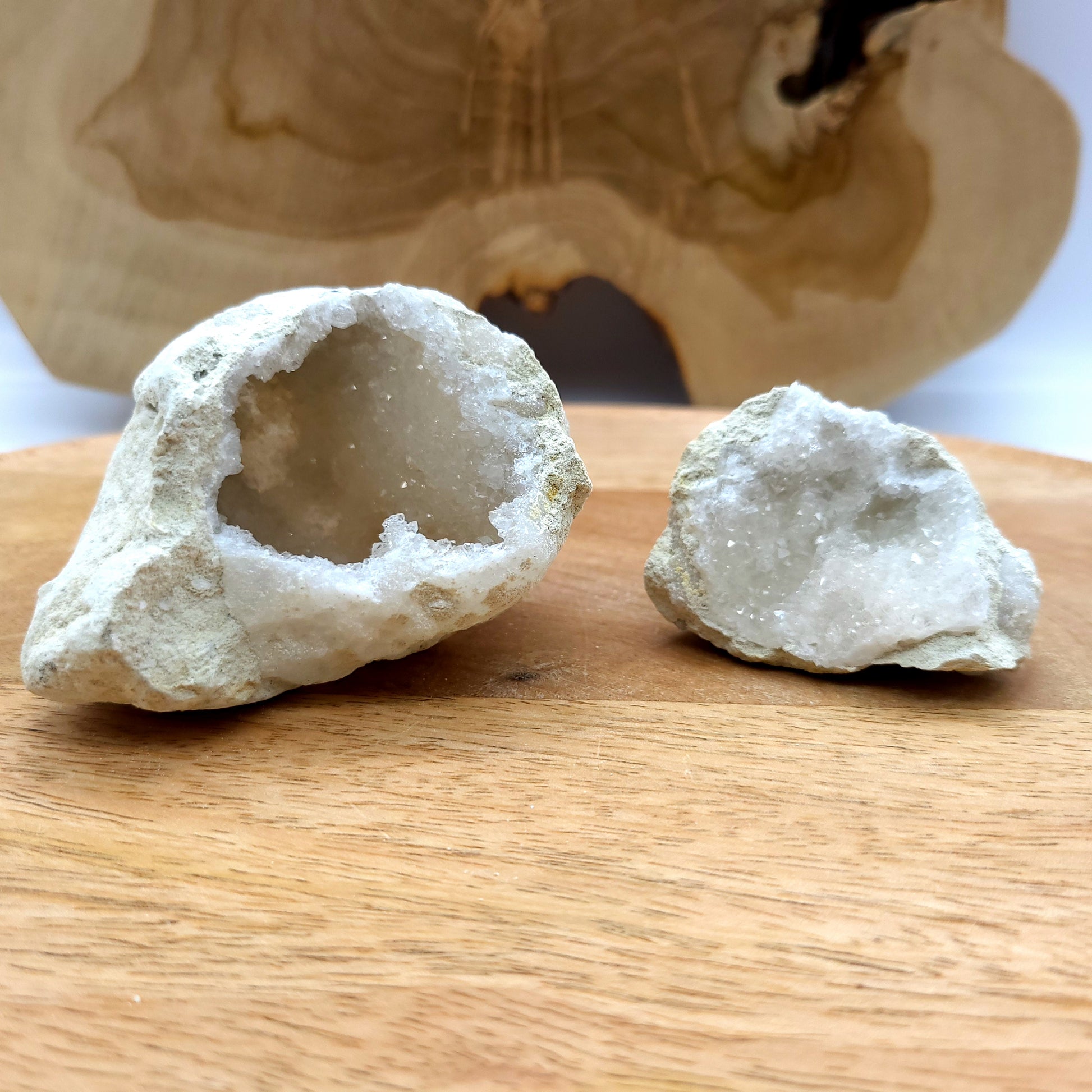 Chacune possède des cristaux des 2 cotés, avec des facettes, un jeu de transparences et nuances blanches, avec des cristaux irréguliers, ce qui lui confère toute sa splendeur. Vendues à l’unité (en lot de 2 parties), à choisir parmi les différentes géodes et tailles proposées ici.