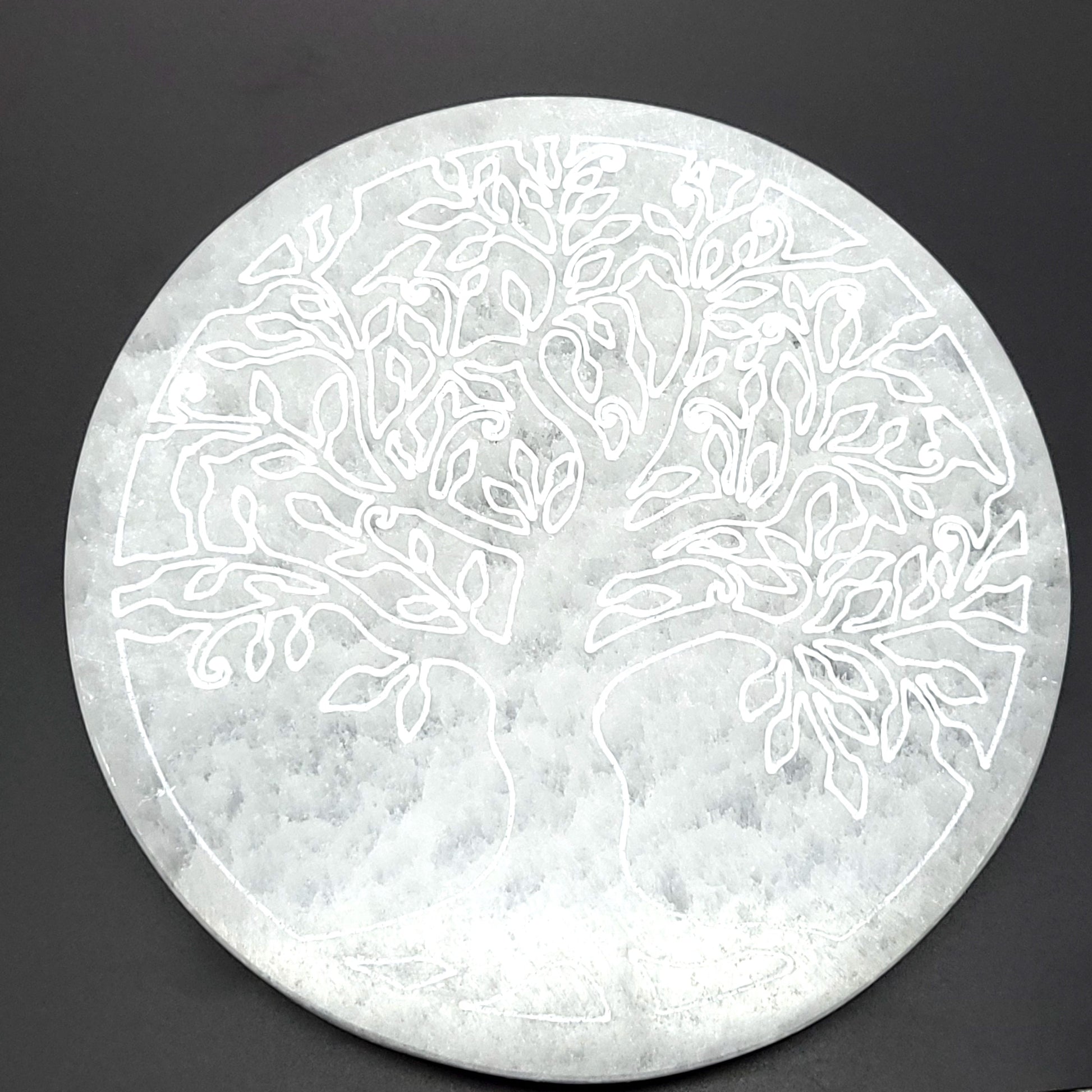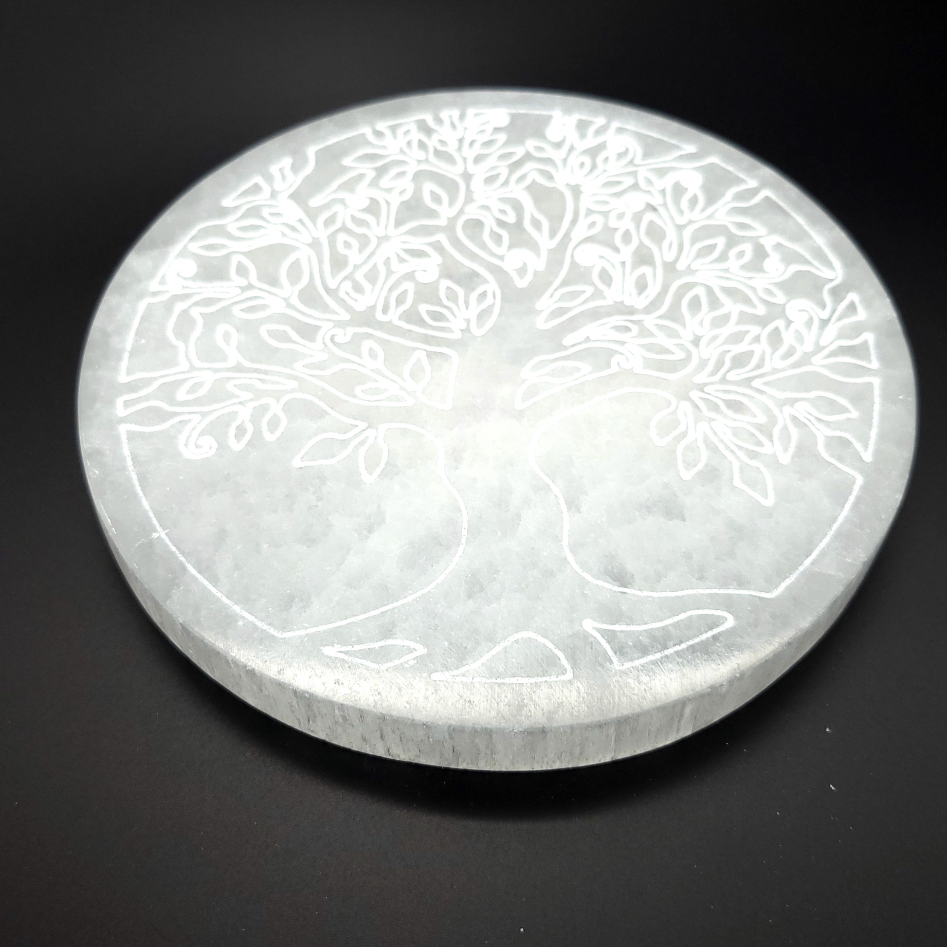 Admirez ce magnifique modèle ARBRE de VIE, symbole puissant gravé sur une PLAQUE en PIERRE SEMI-PRÉCIEUSE de SÉLÉNITE. SCULPTURE RONDE provenant du Maroc.