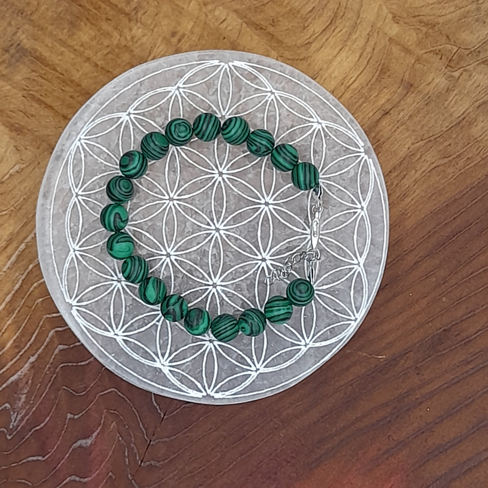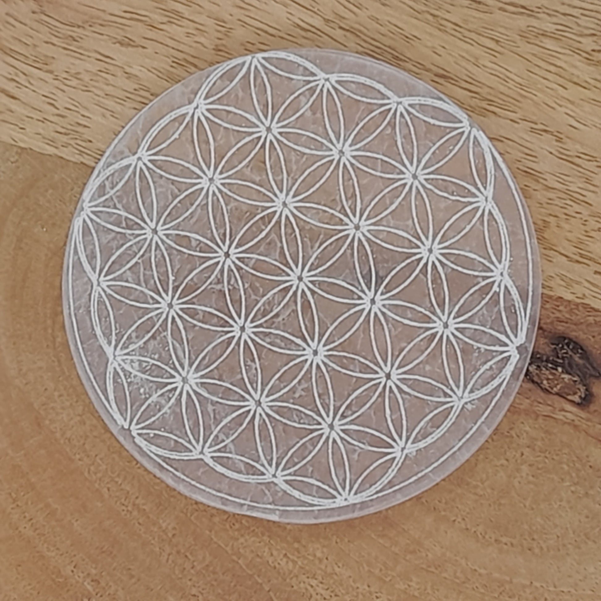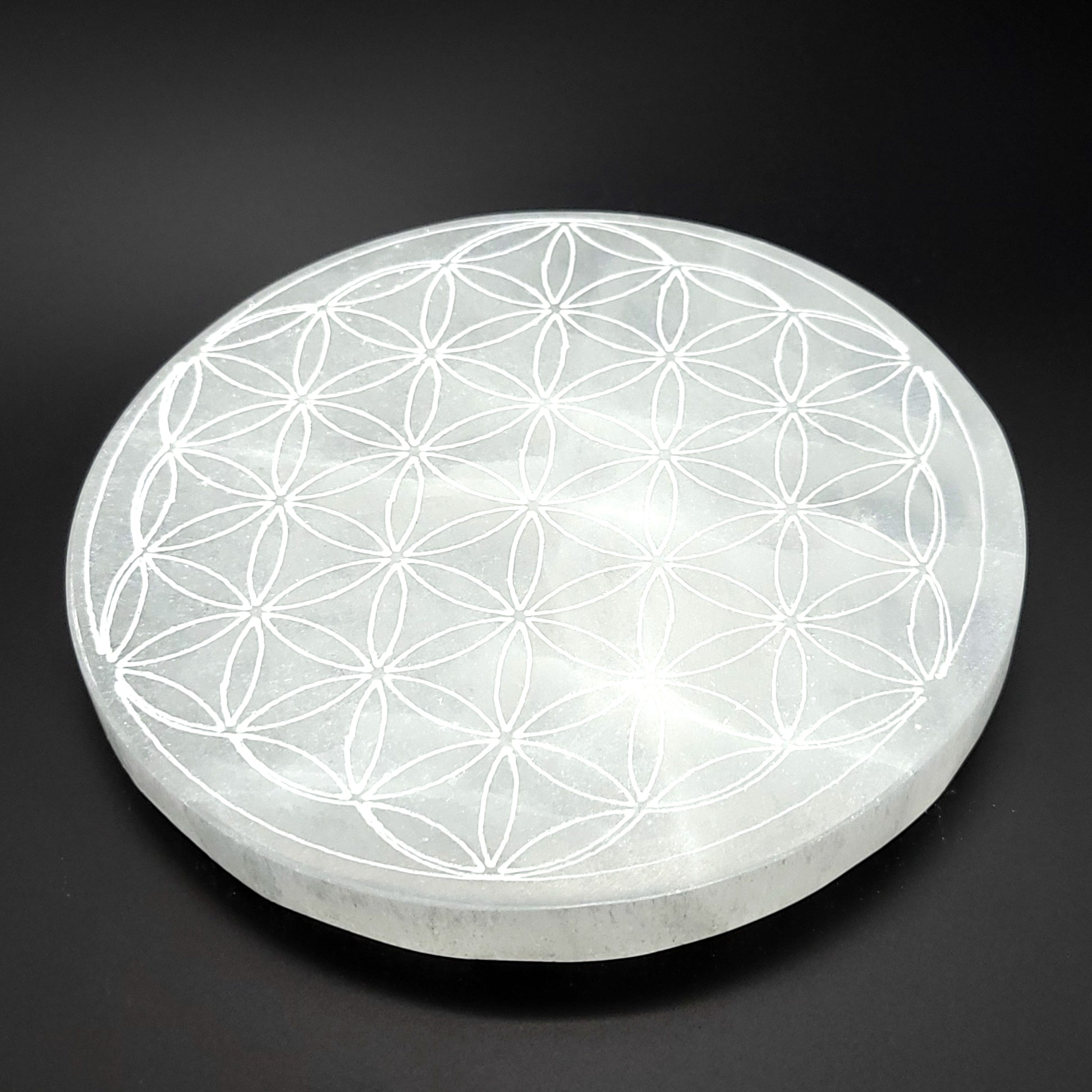 PLAQUE EN SÉLÉNITE GRAVÉE FLEUR DE VIE - STATION DE RECHARGE - UNIQUE, ORIGINALE & ARTISANALE