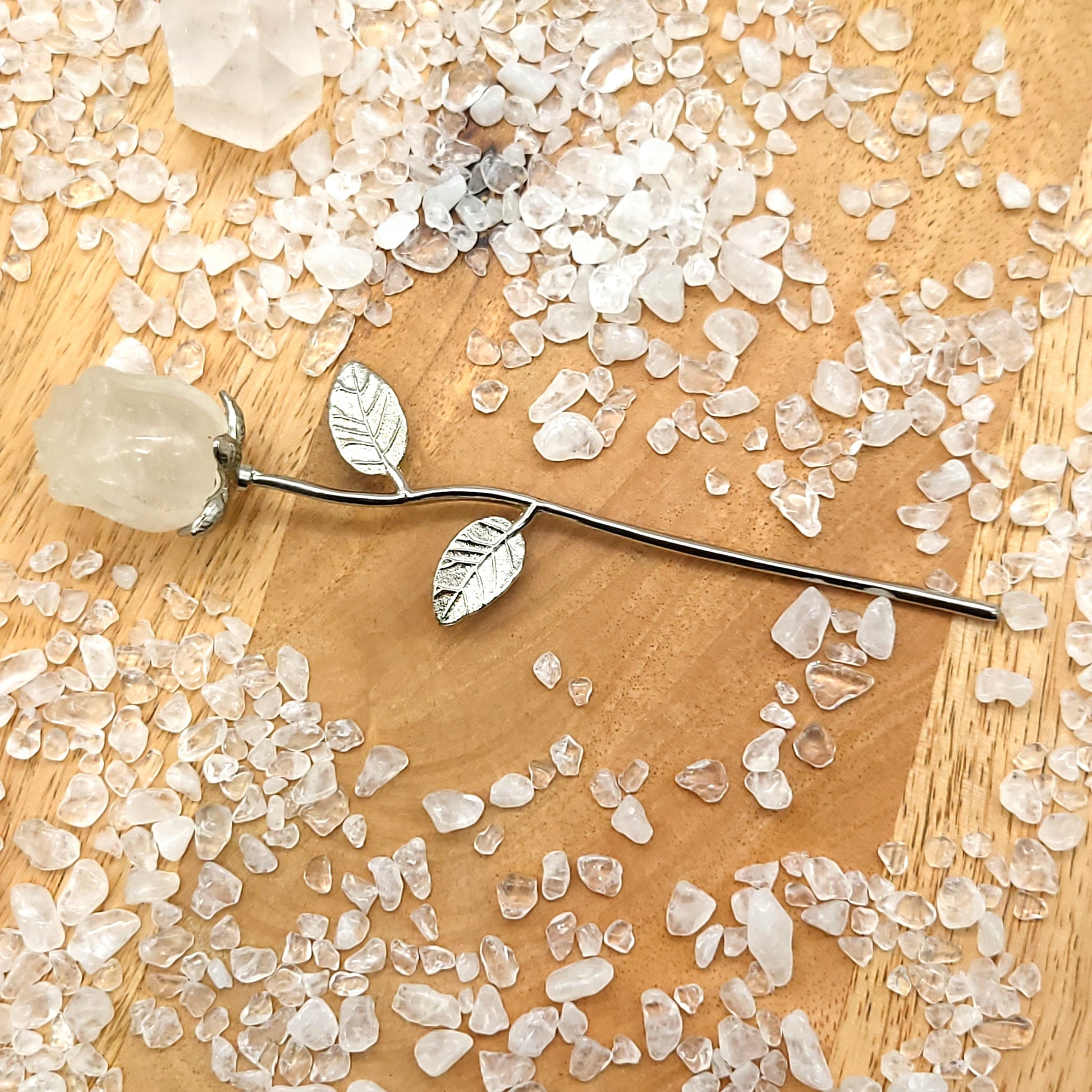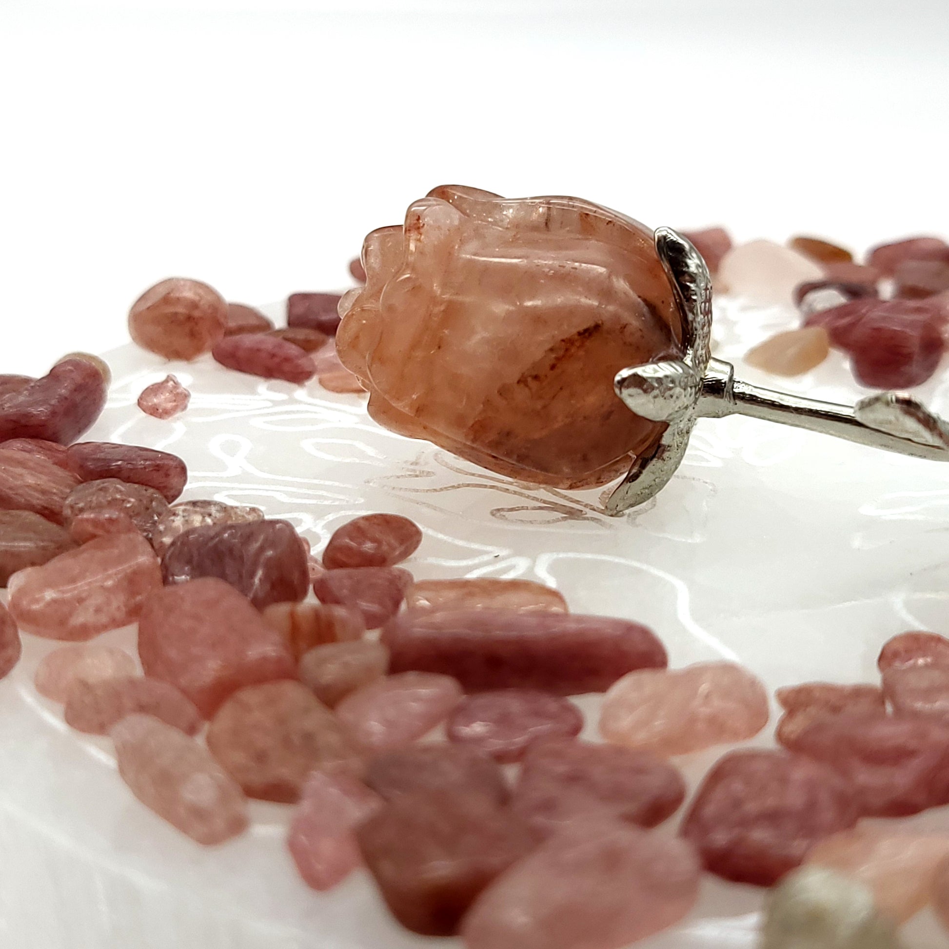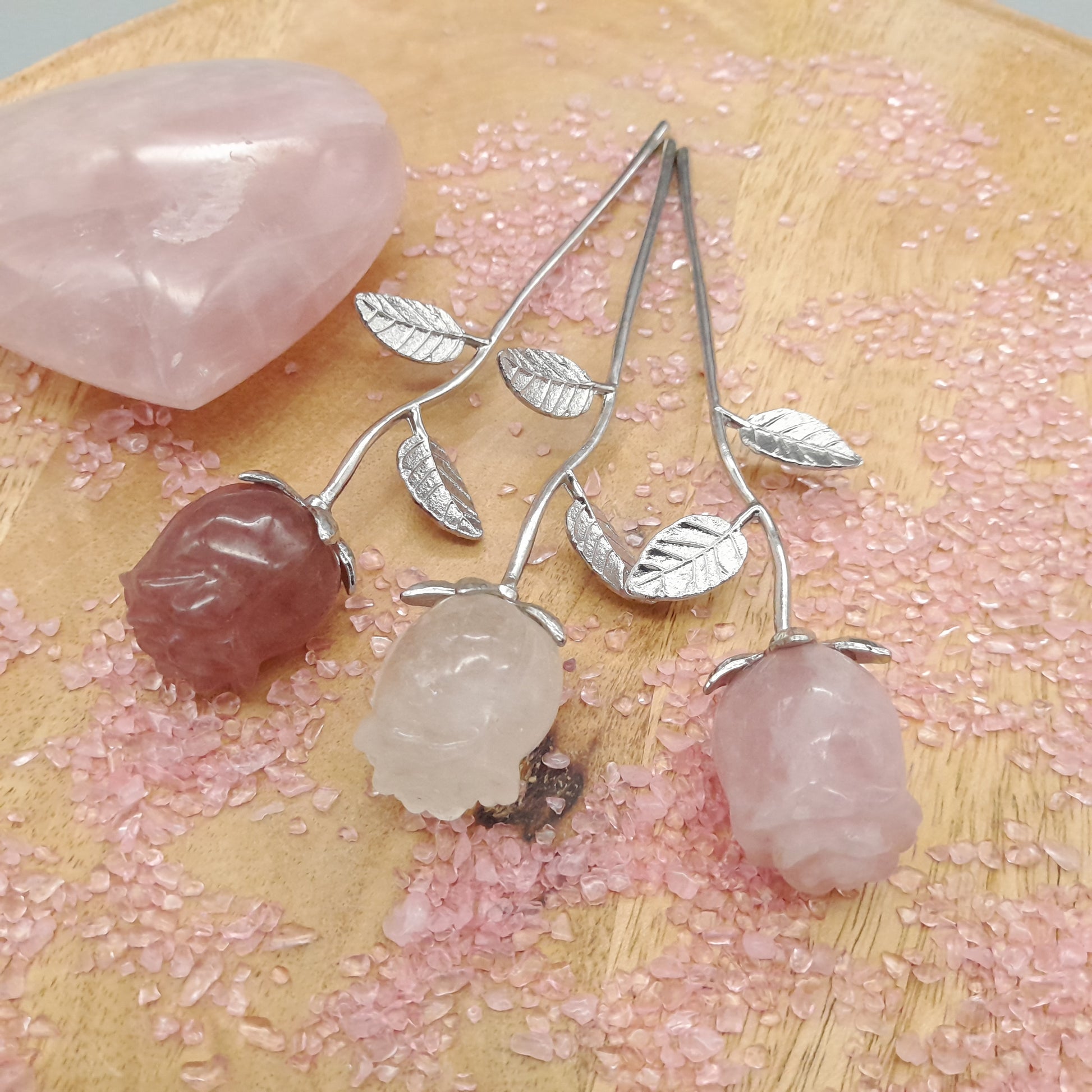 Si vous aimez la NATURE et les FLEURS, alors vous allez adorer ces ROSES en PIERRES SEMI-PRÉCIEUSES de 3 QUARTZ (ROSE, FRAISE ou BLANC) aux nuances brillantes semi opaques. Ces roses ont été sculptées en forme de « boutons » ; les pétales ont des reliefs. Les tiges maintenant les roses ont été étudiées pour mettre parfaitement en valeur chaque fleur. Elles sont conçues en métal argenté, donc solides et rigides, elles possèdent 2 feuilles striées, décalées sur la tige. Les détails et les reliefs sont magnifiques et très réalistes.