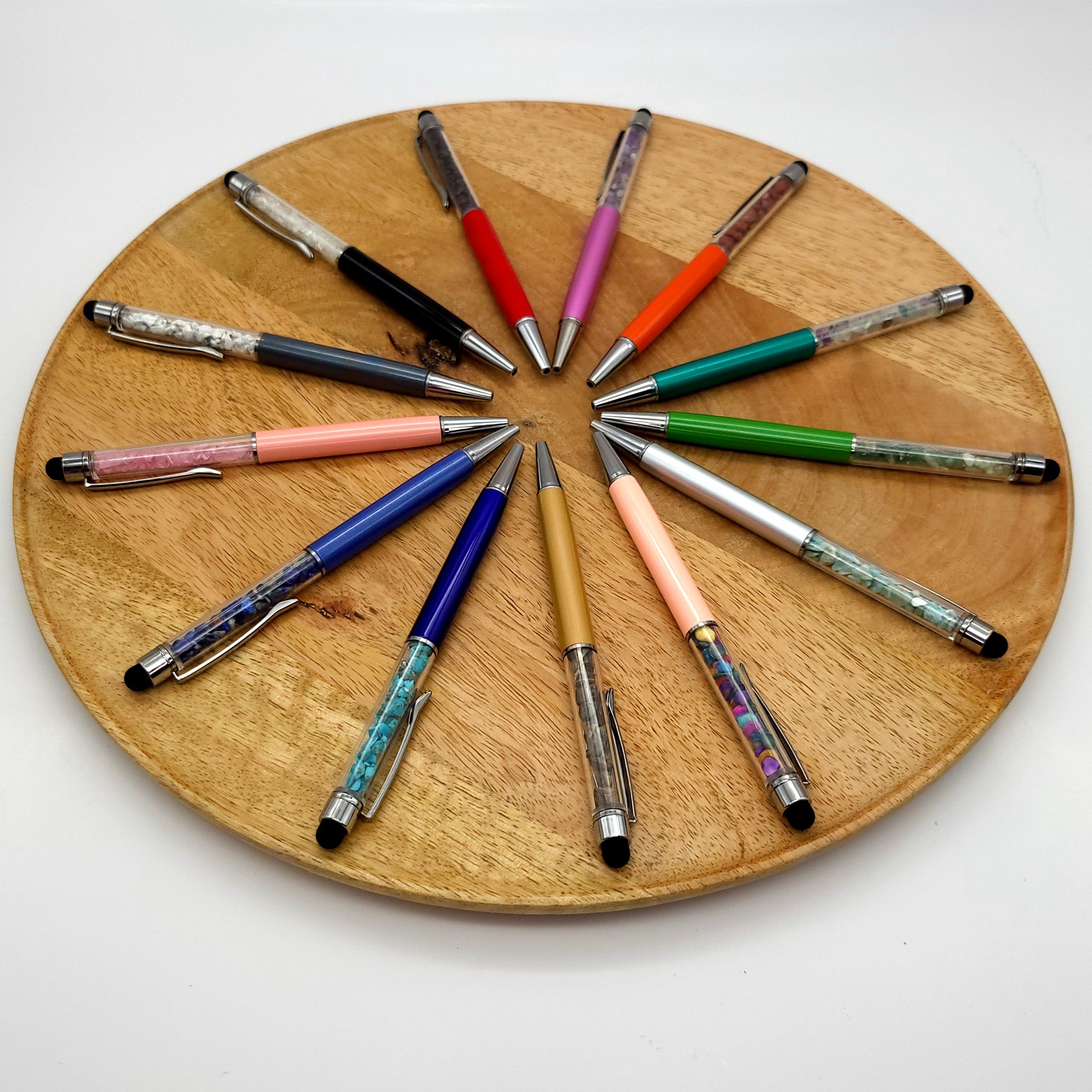 Envie d’un STYLO ORIGINAL et COLORÉ ? Alors vous êtes au bon endroit ! Des STYLOS à BILLES « 2 en 1 » ! En plus d’écrire, ils servent aussi pour naviguer sur votre SMARTPHONE et votre TABLETTE (grâce à un embout adapté (noir à l’extrémité) et un système caché à l’intérieur du stylo qui fait la connexion !) Ils sont en MÉTAL avec une partie transparente (en acrylique) prévue pour bien voir le décor au travers. Dans ceux là, on a choisi d’y insérer de vraies chips (éclats) de PIERRES SEMI-PRÉCIEUSES NATURELLES de tailles différentes. La pointe est assez fine, l’encre est noire (voir photos), la cartouche est échangeable quand l’encre sera épuisée ou bien si vous souhaitez une autre couleur.