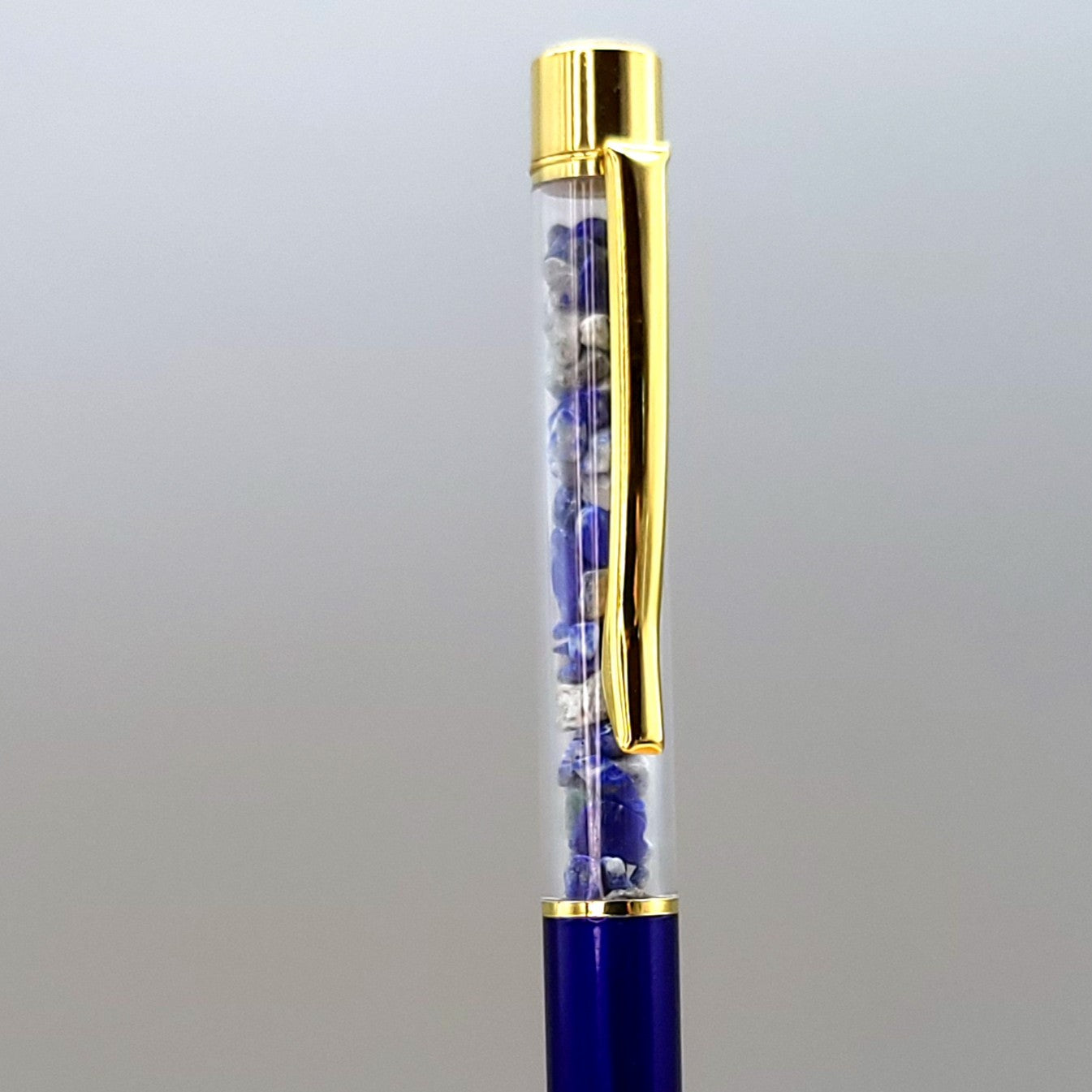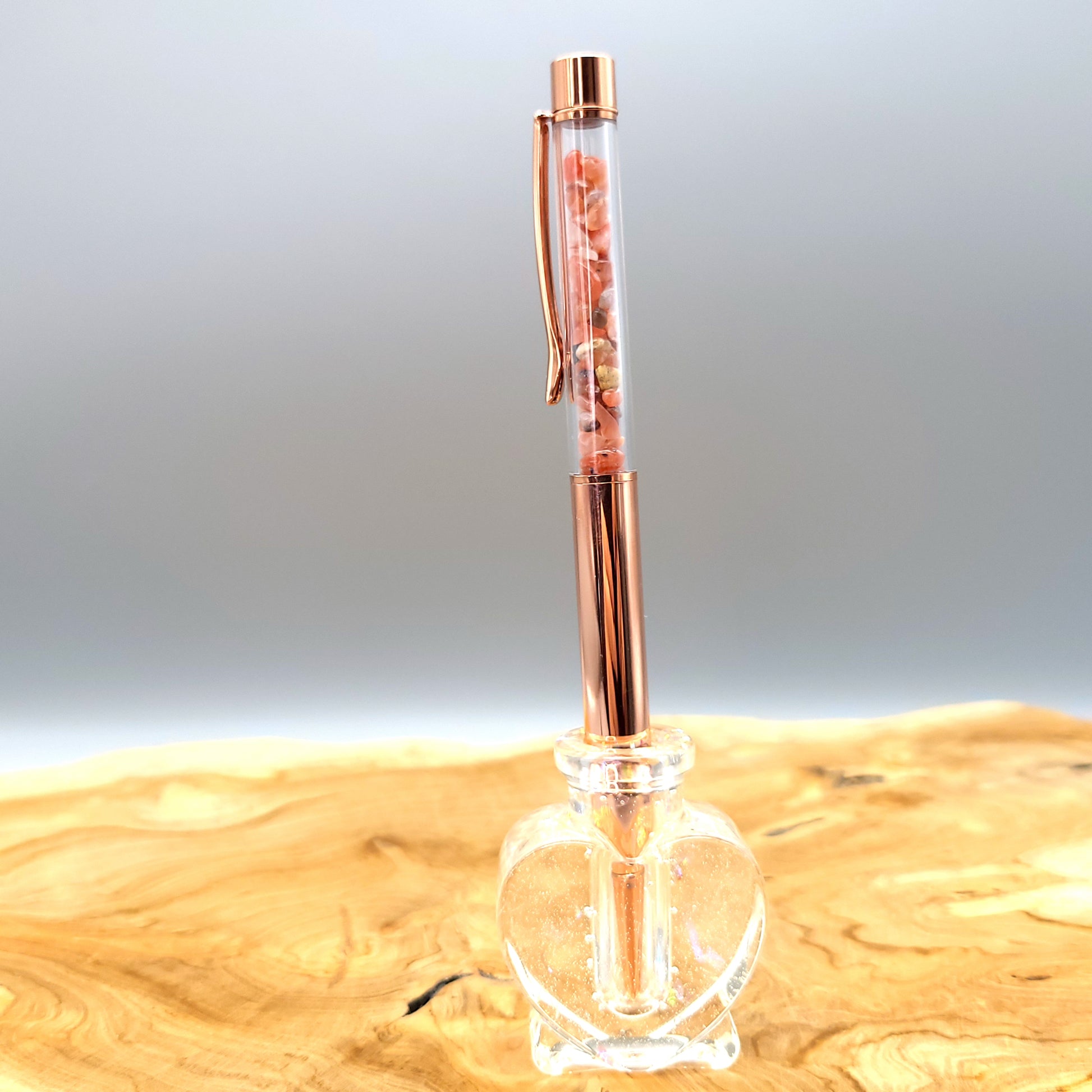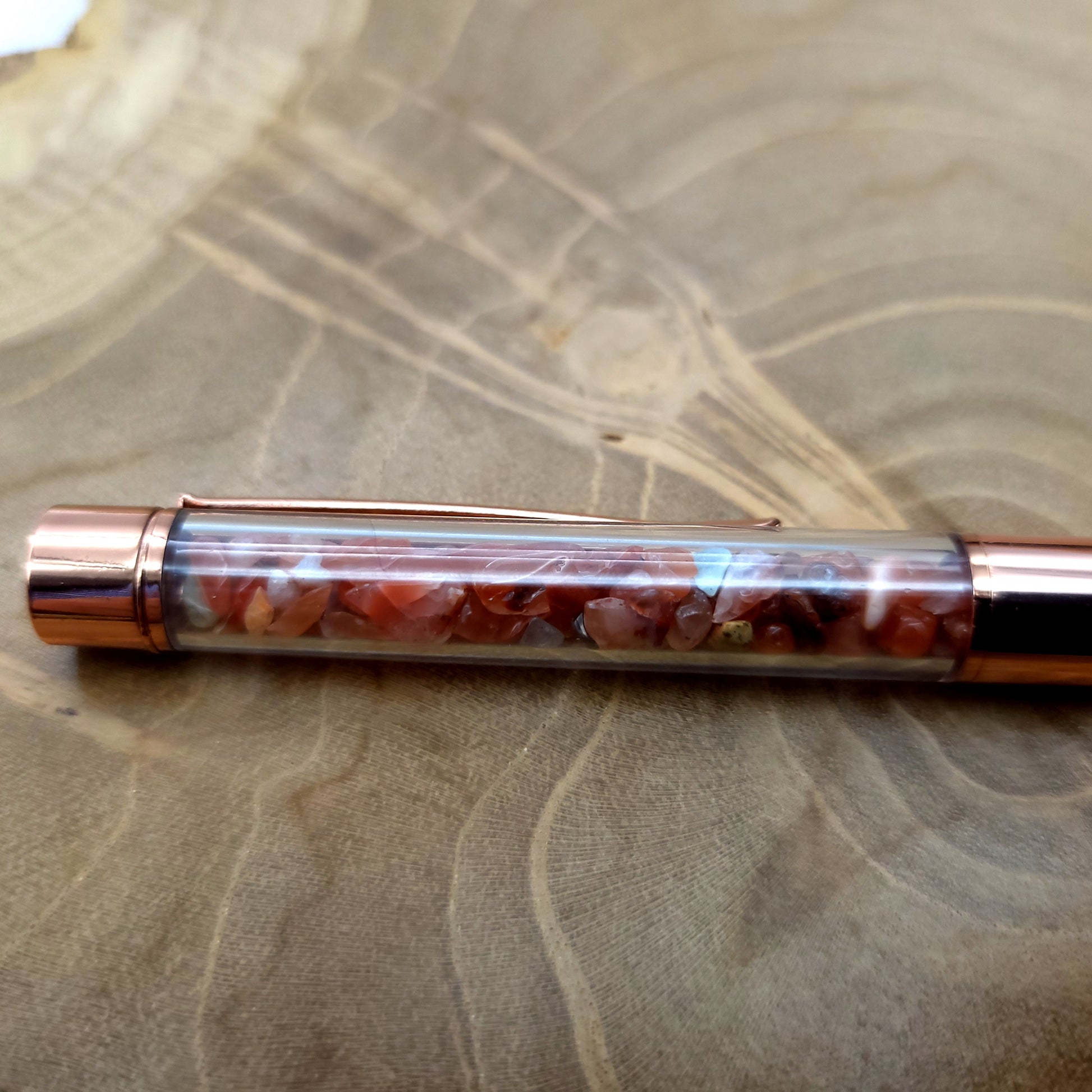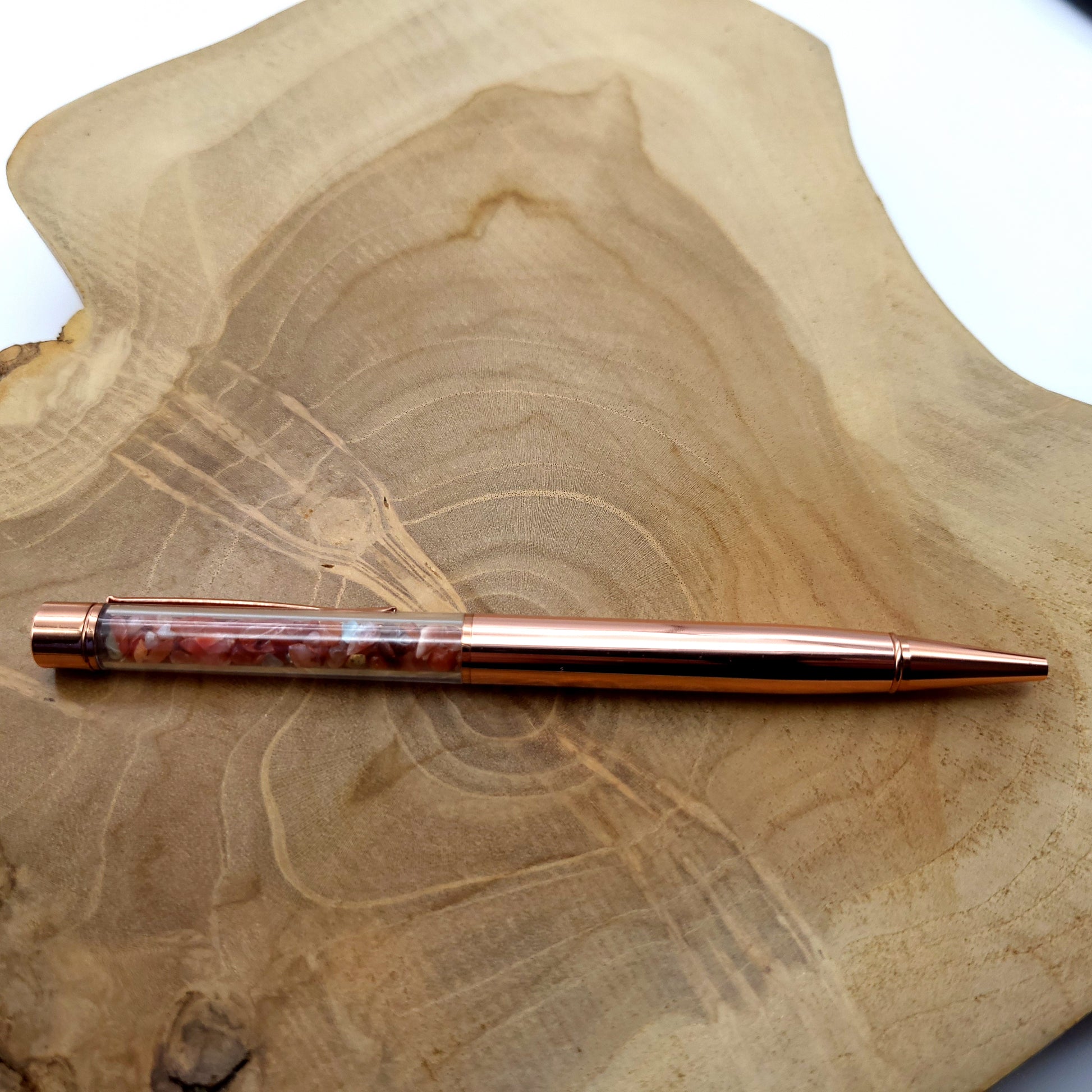 Envie d’un STYLO ORIGINAL et COLORÉ ? Alors vous êtes au bon endroit ! Des STYLOS à BILLES en MÉTAL (doré ou rose) avec une partie transparente (en acrylique) prévue pour bien voir le décor des pierres au travers. Dans ceux là, de vraies chips (éclats) de PIERRES SEMI-PRÉCIEUSES NATURELLES de tailles différentes ont été insérées. La pointe est assez fine, l’encre est noire (voir photos), la cartouche est échangeable quand l’encre sera épuisée ou bien si vous souhaitez une autre couleur.