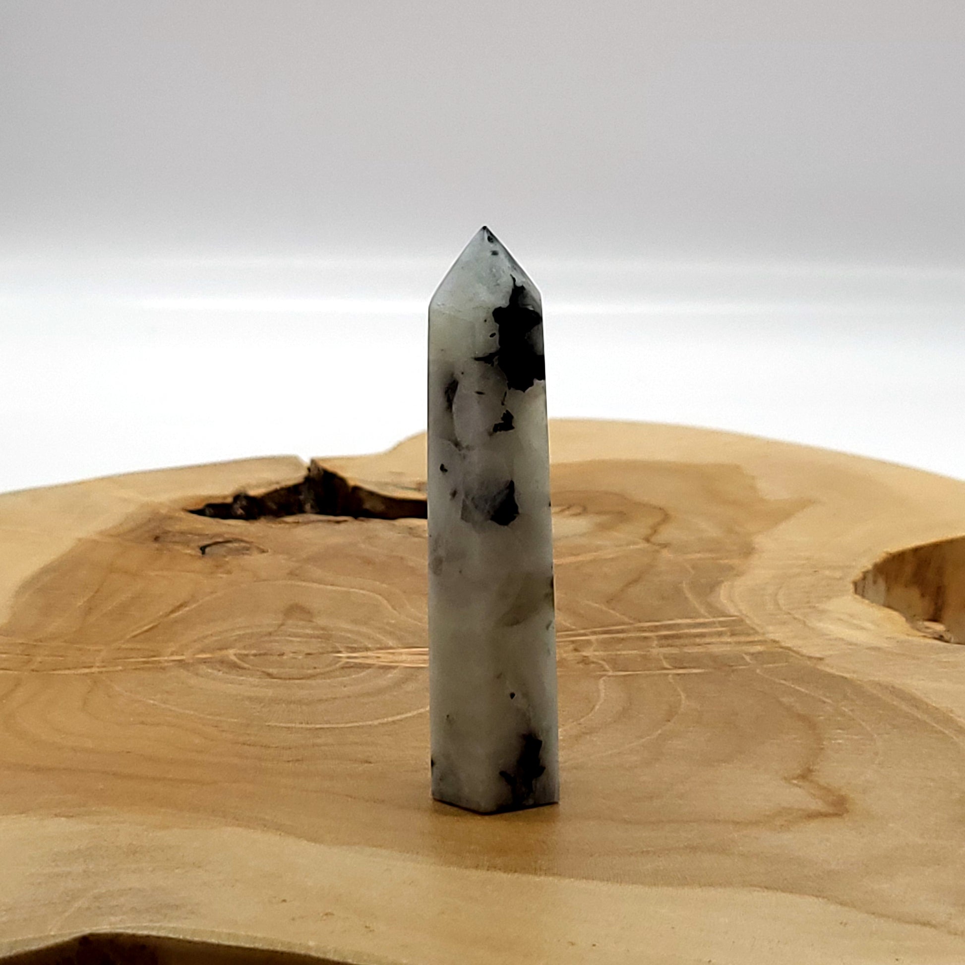 Intrigante et lumineuse cette TOUR en POINTE sculptée en PIERRE de LUNE SEMI-PRÉCIEUSE (coloris blanc, gris aux taches noires + reflets) au toucher lisse. Vendue à l’unité, à choisir parmi les différentes tailles (et pierres proposées ici).